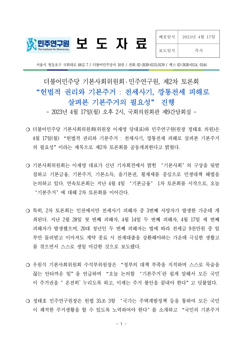 [보도자료] 더불어민주당 기본사회위원회ㆍ민주연구원, 제2차 토론회 "헌법적 권리와 기본주거:전세사기, 깡통전세 피해로 살펴본 기본주거의 필요성" 진행