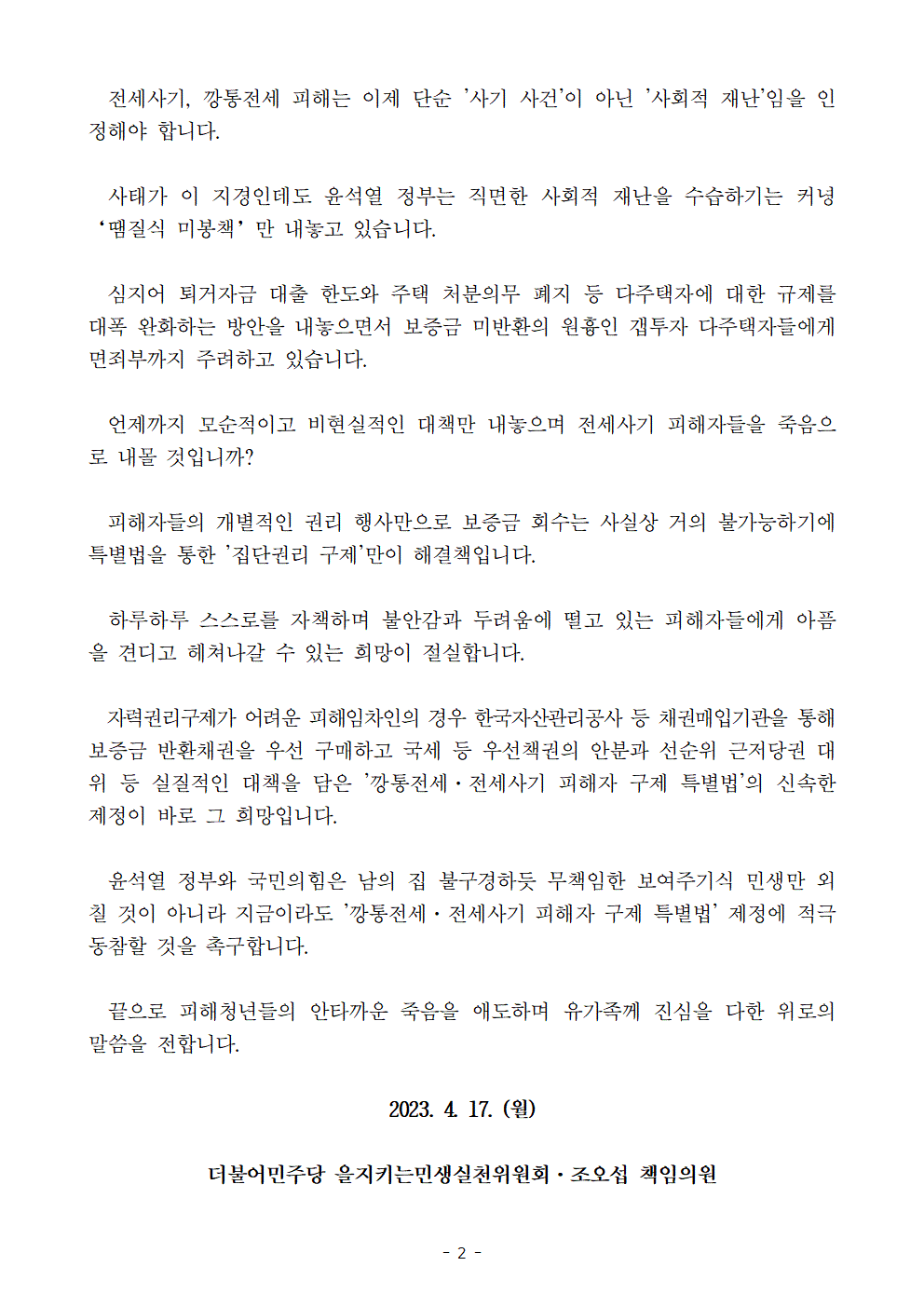 [기자회견문] 더불어민주당 을지로위원회, 전세사기 피해자 잇따른 죽음을 막기 위해 ‘전세사기 피해자 구제 특별법’을 신속히 제정해야 합니다.