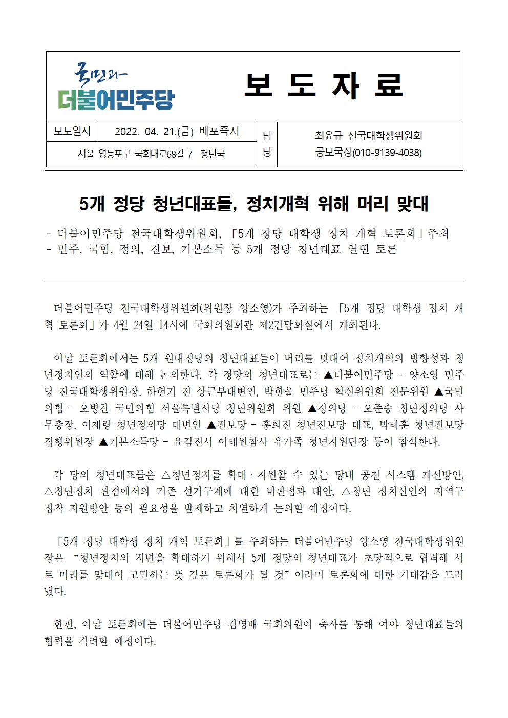 [보도자료] 더불어민주당 전국대학생위원회, 5개 정당 청년대표들, 정치개혁 위해 머리 맞대