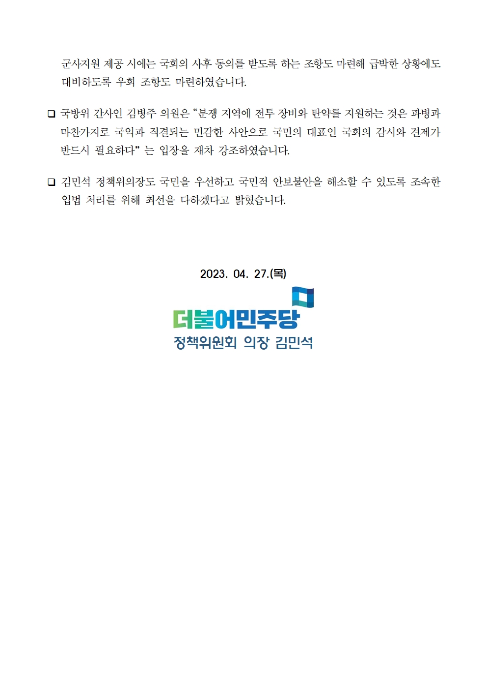 [보도자료] 더불어민주당 정책위원회, 국제적 분쟁 지역에 대한 대여, 양도, 수출 등 군사 지원 시 국회 승인 의무화 법안 발의