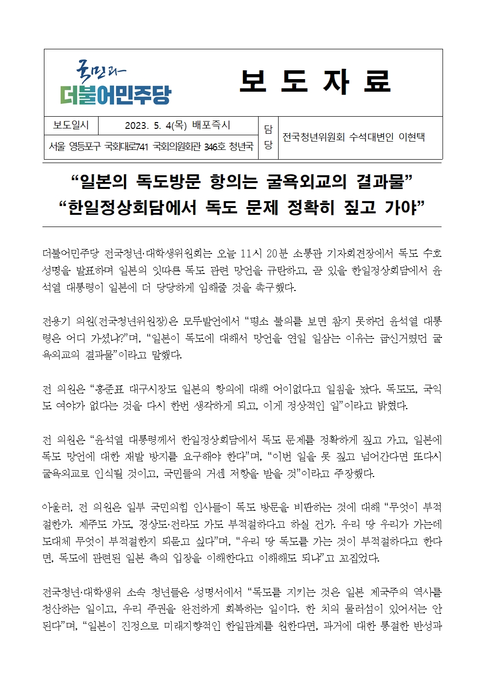 [보도자료] 더불어민주당 전국청년위·대학생위원회, 일본의 독도방문 항의는 굴욕외교의 결과물, 한일정상회담에서 독도 문제 정확히 짚고 가야
