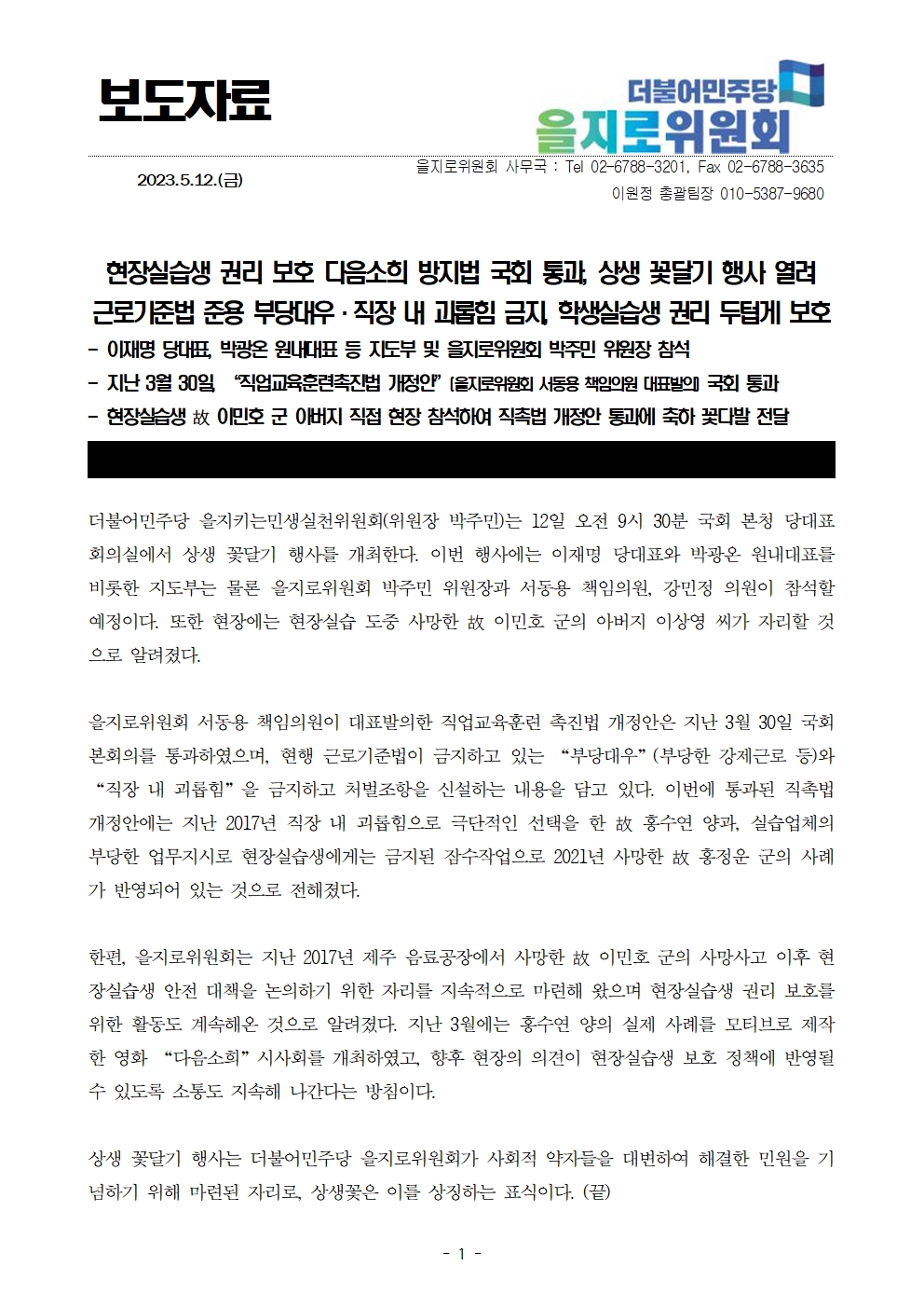 [보도자료] 더불어민주당 을지로위원회, '현장실습 권리 보호 다음소희 방지법 국회 통과, 상생 꽃달기 행사 열려'