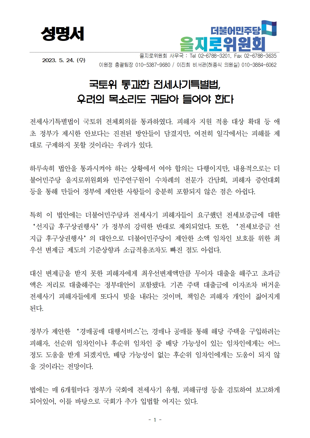 [성명서] 더불어민주당 을지로위원회, '국토위 통과한 전세사기특별법, 우려의 목소리도 귀담아 들어야 한다'