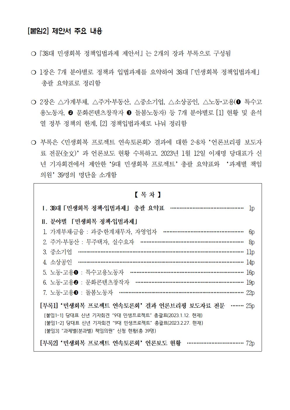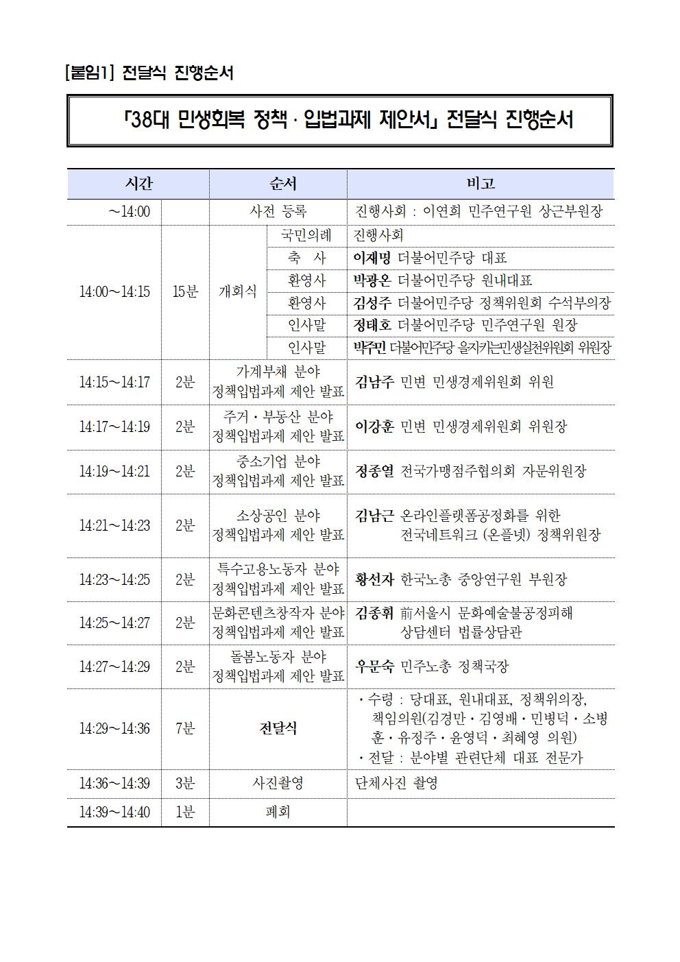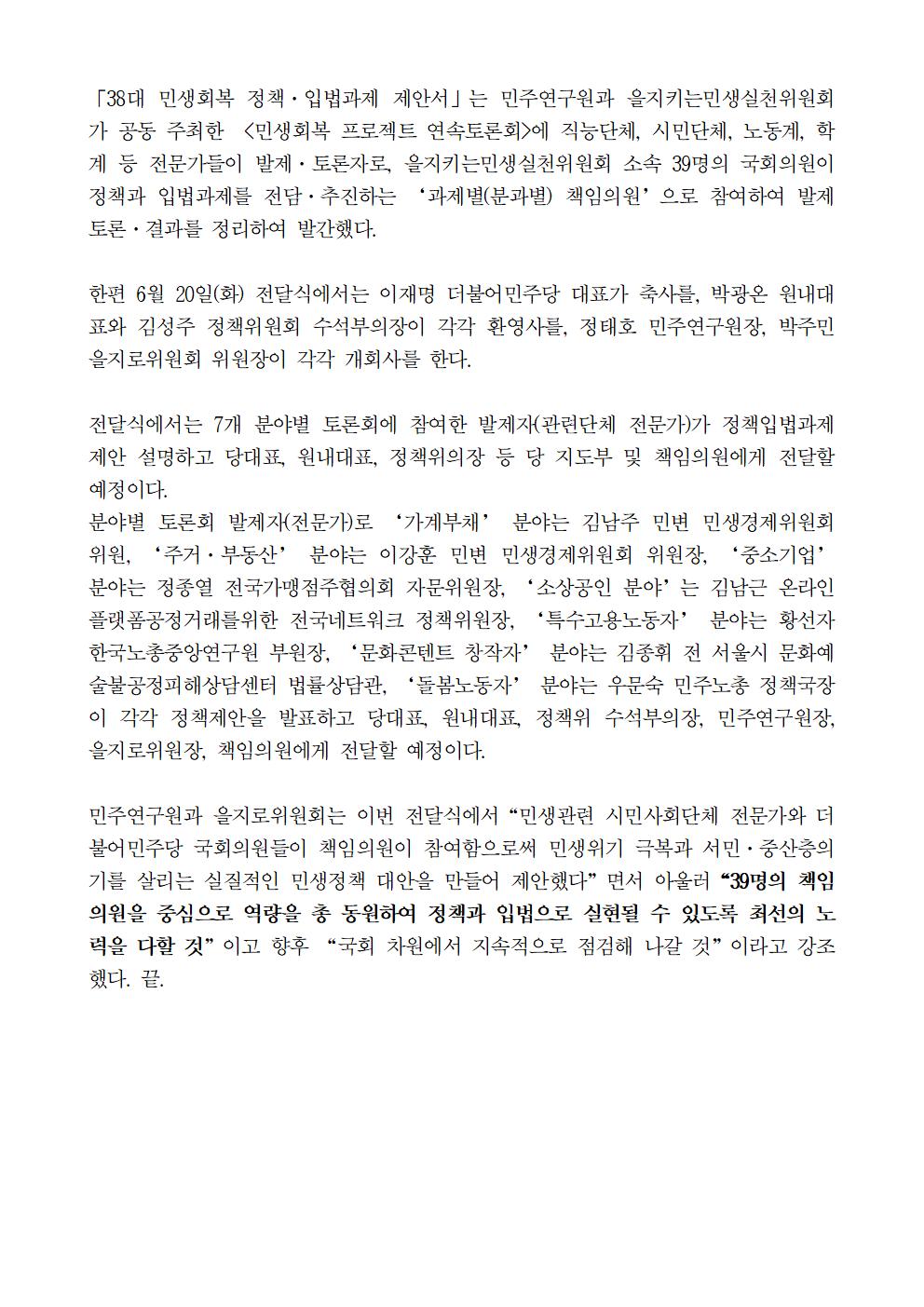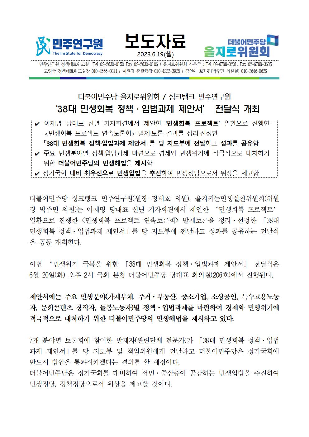 230619_보도자료_38대민생회복_정책입법과제제안서_전달식(민주연구원+을지로위원회)(수정1).hwp