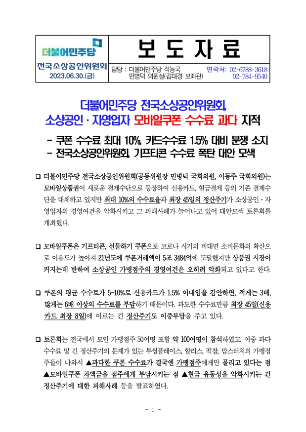 [보도자료] 더불어민주당 전국소상공인위원회, 소상공인, 자영업자 모바일쿠폰 수수료 과다 지적