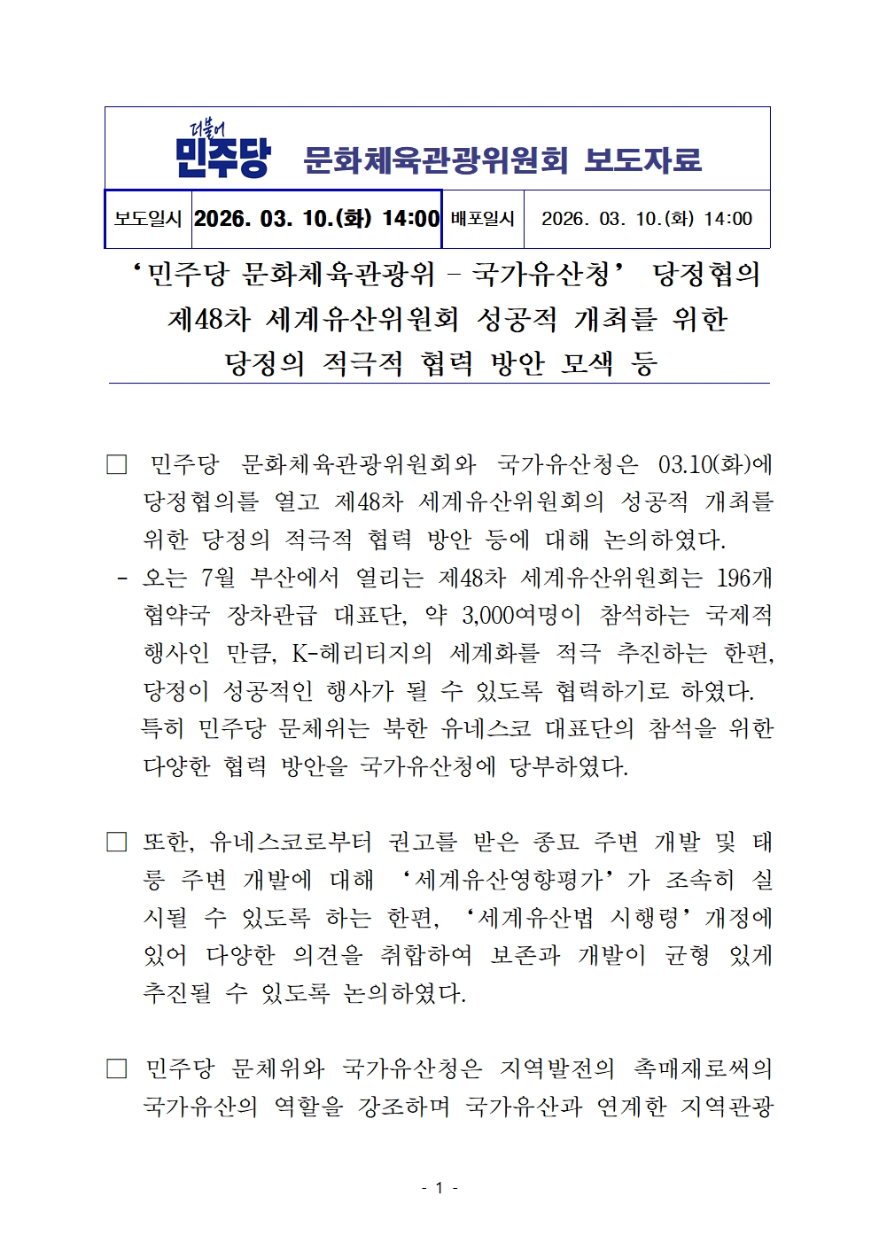 민주당_문체위_국가유산청_당정협의_보도자료260310v2.hwp