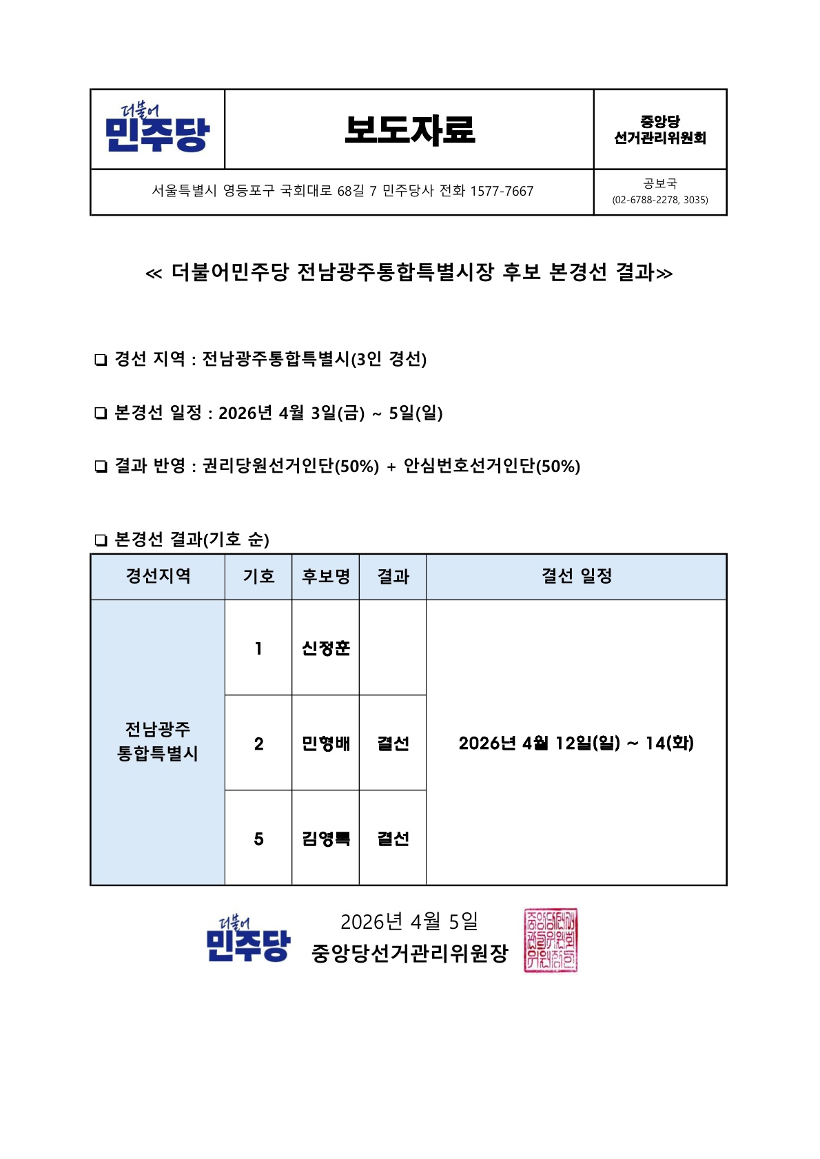 더불어민주당 중앙당선거관리위원회, 더불어민주당 전남광주통합특별시장 후보 본경선 결과