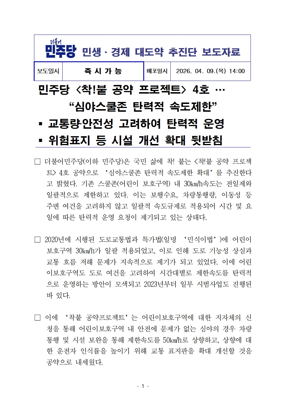 더불어민주당 민생·경제대도약 추진단, <착!붙 공약 프로젝트> 4호… “심야스쿨존 탄력적 속도제한”