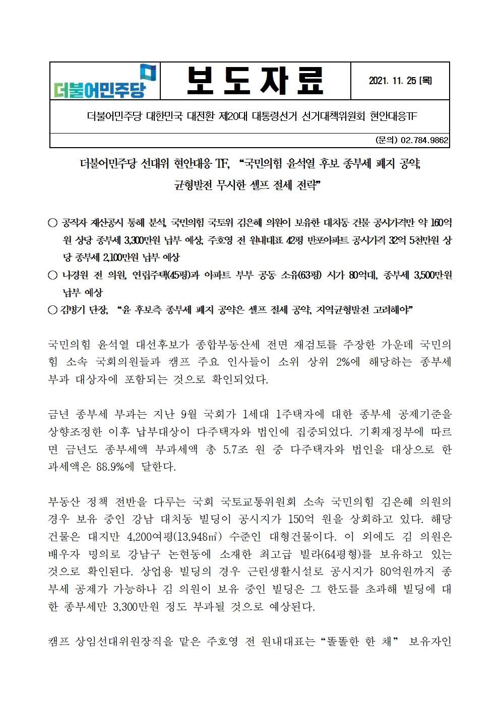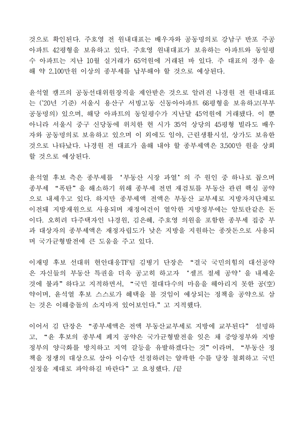 [보도자료] 더불어민주당 선대위 현안대응TF, "국민의힘 윤석열 후보 종부세 폐지 공약, 균형발전 무시한 셀프 절세 전략"