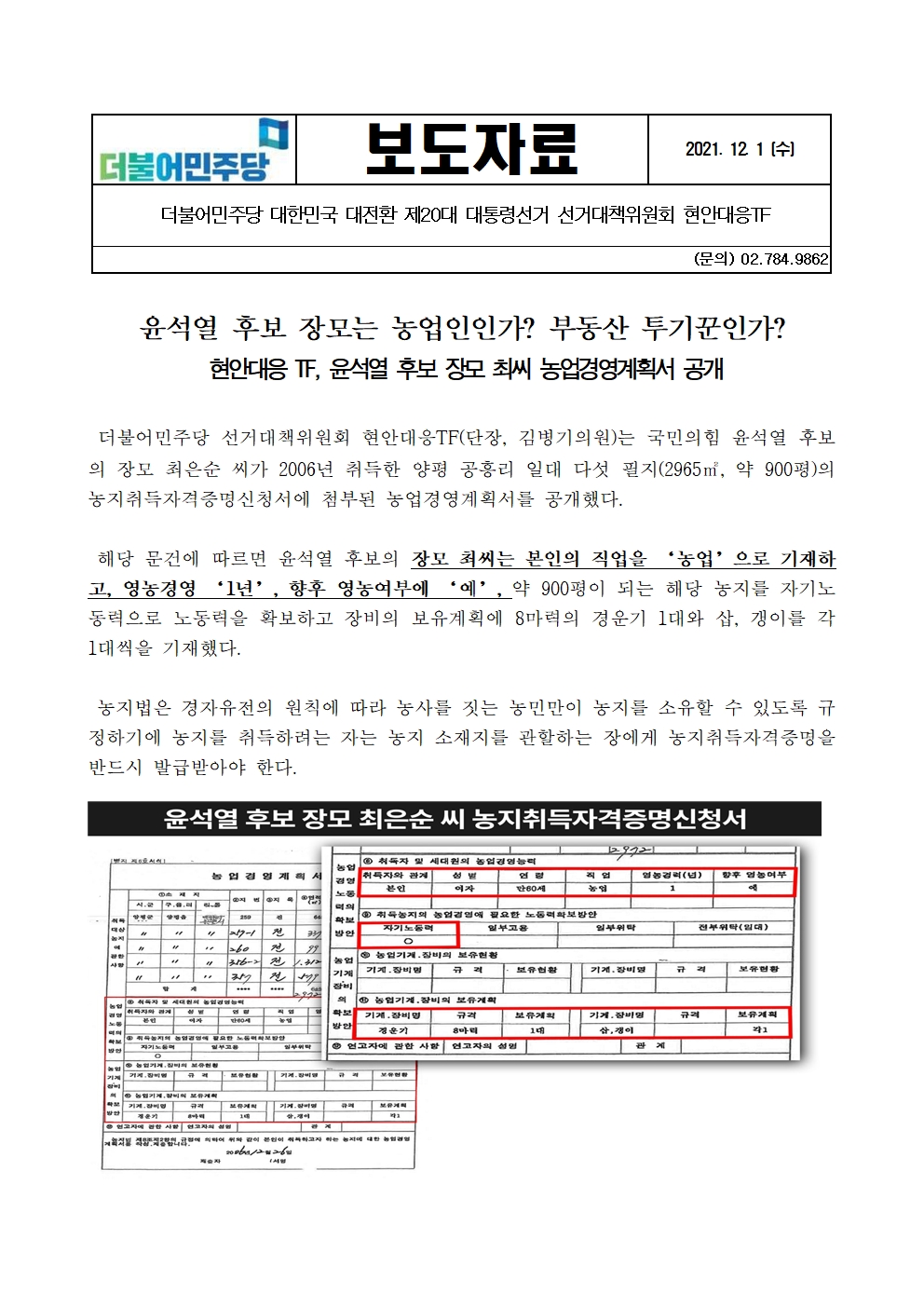 [보도자료] 더불어민주당 선대위 현안대응 TF, 윤석열 후보 장모는 농업인인가 부동산 투기꾼인가