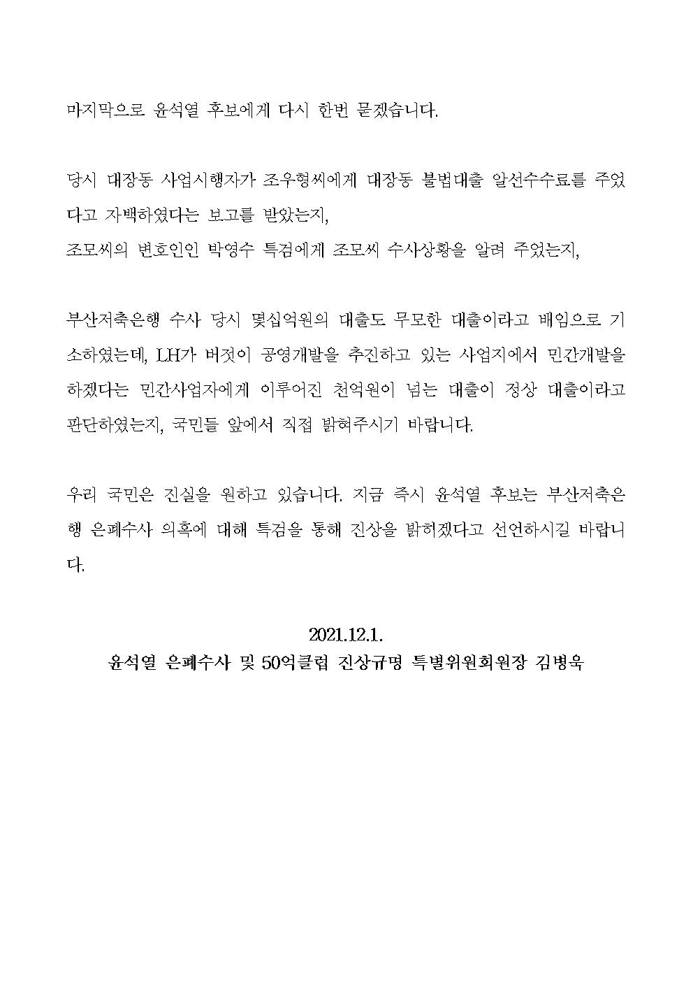 [기자회견문] 윤석열 은폐수사 및 50억 클럽 진상규명 특별위원회, 대장동 및 부산저축은행 관련 국민의힘 사실왜곡 규탄
