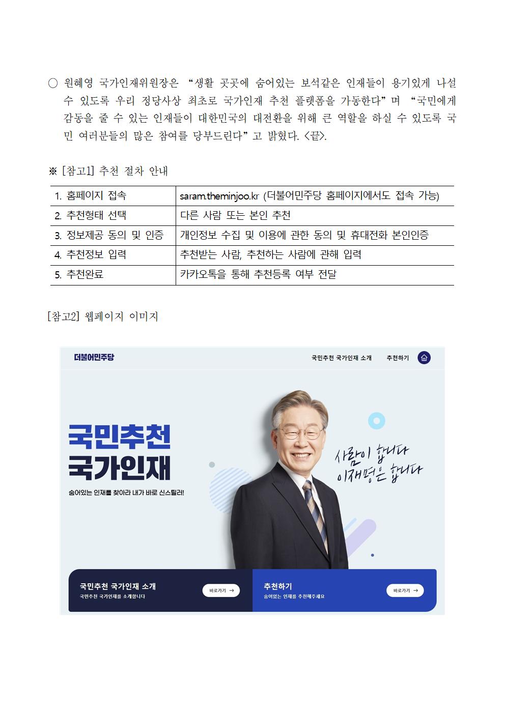 [보도자료] 더불어민주당 선대위 국가인재위원회, 국가인재 직접 추천 국민추천 국가인재 플랫폼 가동