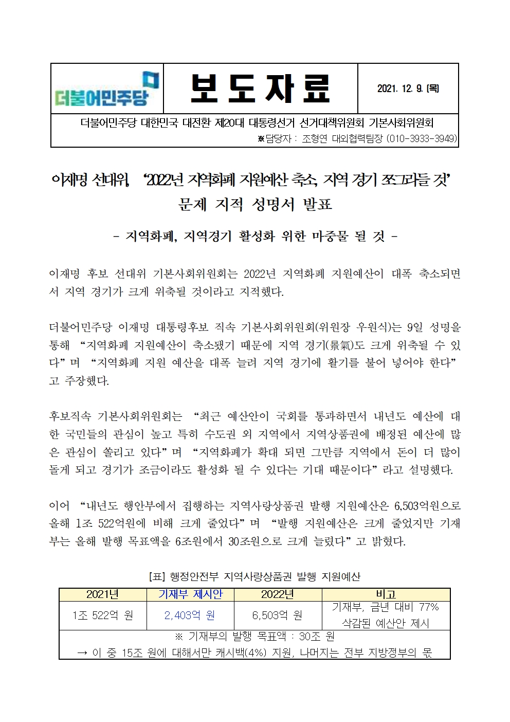 [보도자료] 더불어민주당 선대위 기본사회위원회, 22년 지역화폐 예산 축소 문제 지적 성명서 발표