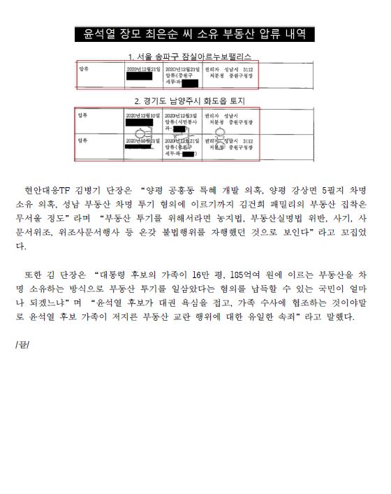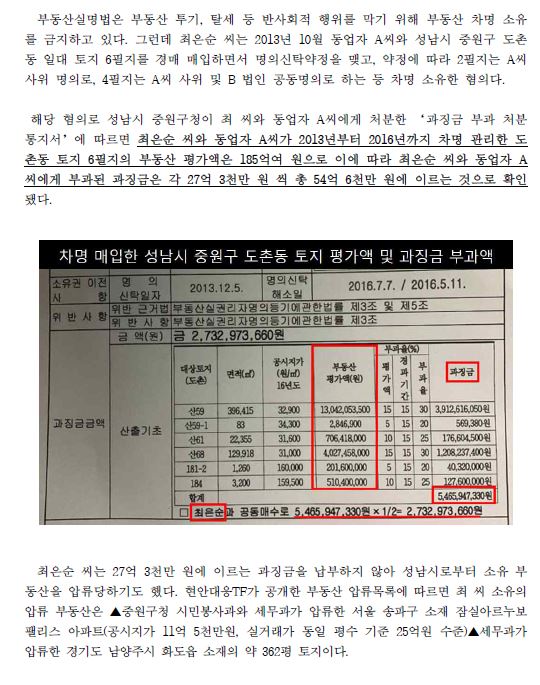 [보도자료] 윤석열 장모 최씨 성남시 일대 16만평 185억 상당 차명 소유 혐의. 성남 중원구청, 과징금 54억 부과