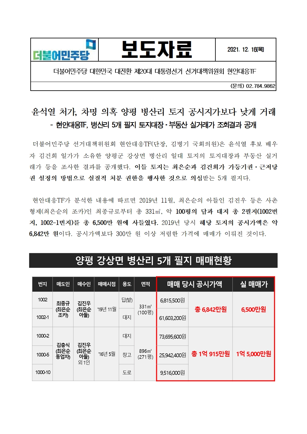 [보도자료] 더불어민주당 선대위 현안대응TF, 윤석열 처가, 차명 의혹 양평 토지 공시지가보다 낮게 거래