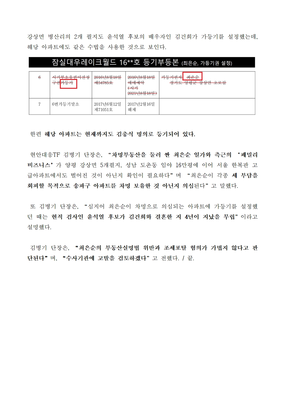 [보도자료] 더불어민주당 선대위 현안대응TF, 최은순 송파구 60평대 고급아파트 차명보유 의혹 관련 법원 약식명령서 등 공개