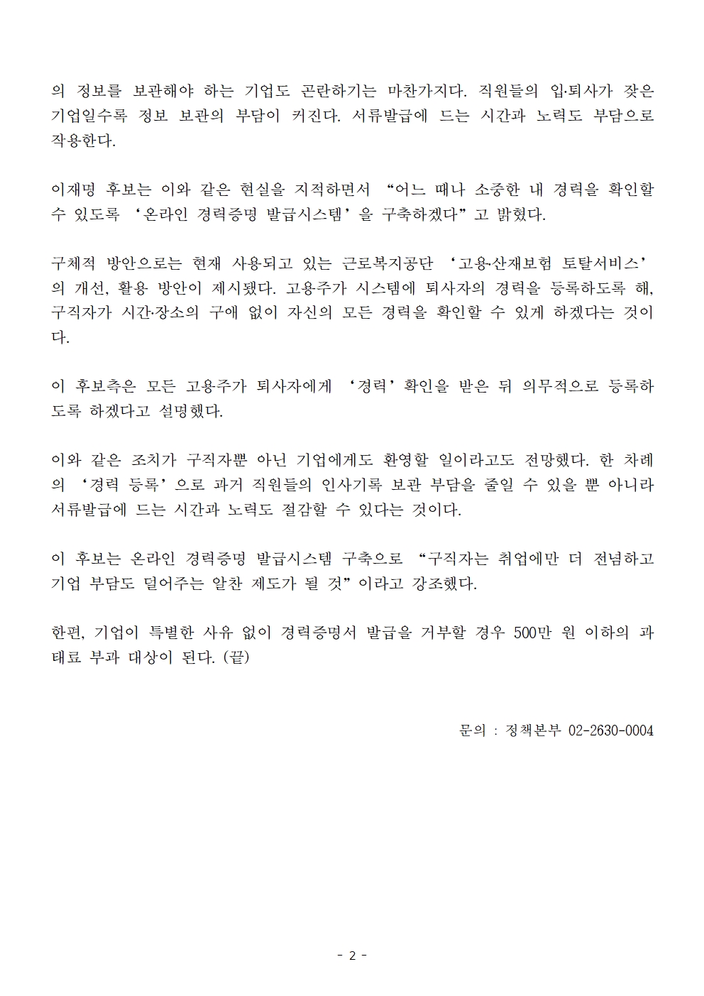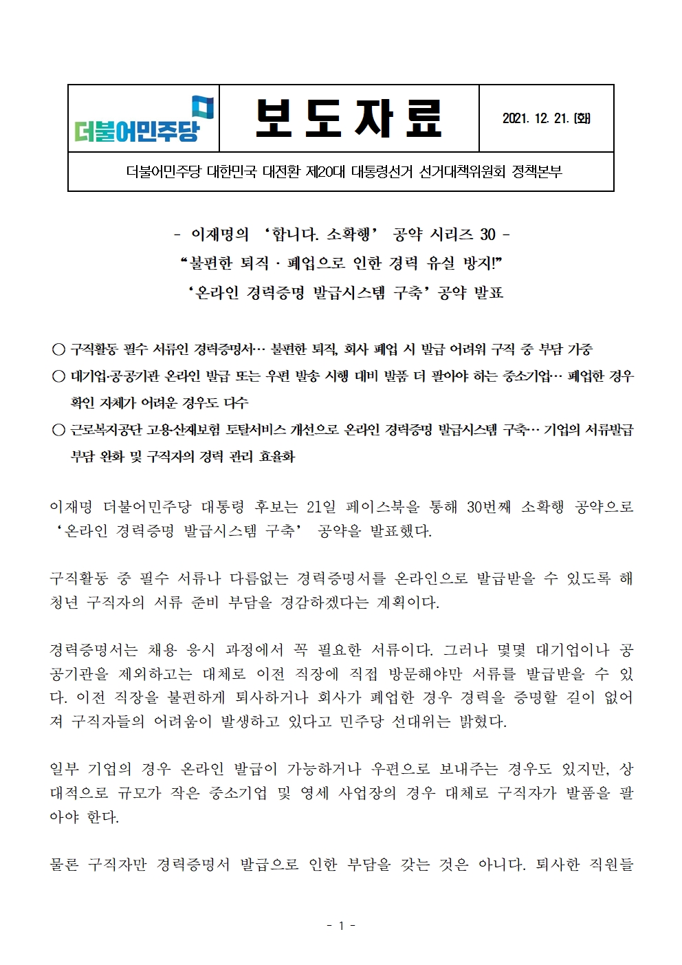 [보도자료] 더불어민주당 선대위 정책본부, '이재명의 합니다. 소확행 공약 시리즈 30' 온라인 경력증명 발급 시스템 구축 공약