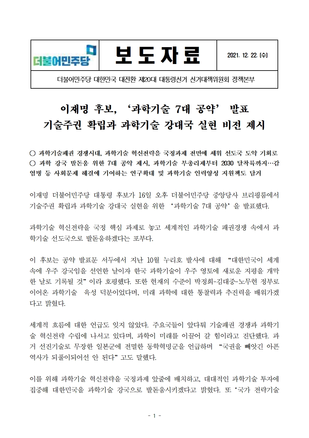 [보도자료] 더불어민주당 선대위 정책본부_이재명 후보 과학기술 7대 공약 발표_기술주권 확립과 과학기술 강대국 실현 비전 제시