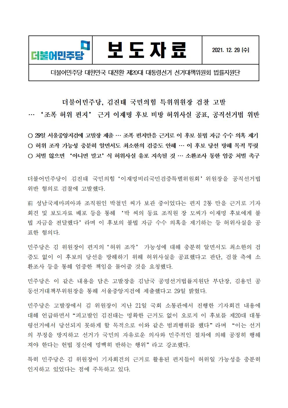[보도자료] 더불어민주당 선대위 법률지원단 국민의힘 김진태 특위위원장 고발