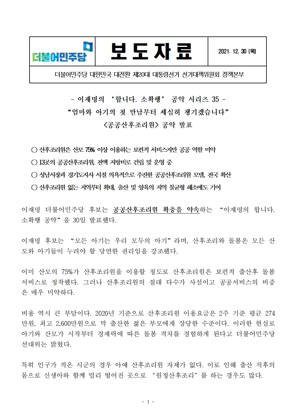 [보도자료] 더불어민주당 선대위 정책본부, '이재명은 합니다. 소확행 공약 시리즈 35' 공공산후조리원 공약