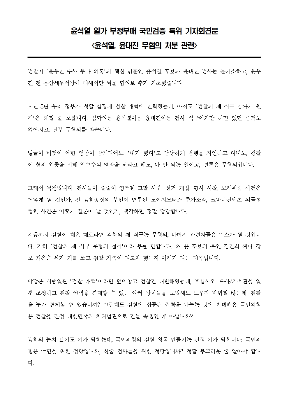 [기자회견문] 윤석열 일가 부정부패 국민검증 특위, 윤석열, 윤대진 무혐의 처분 관련