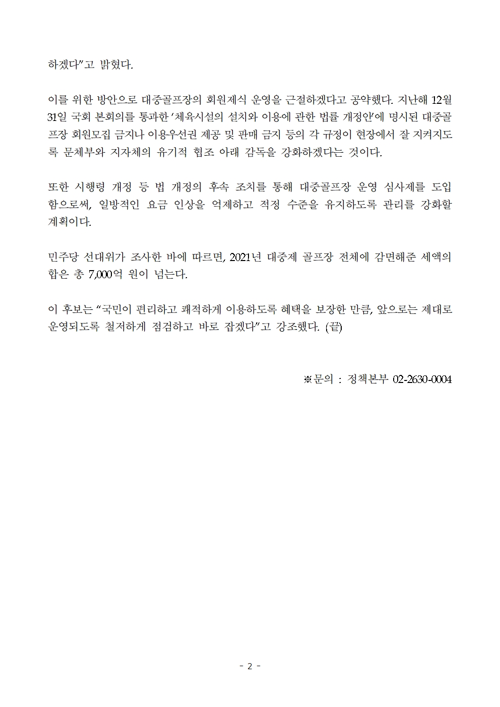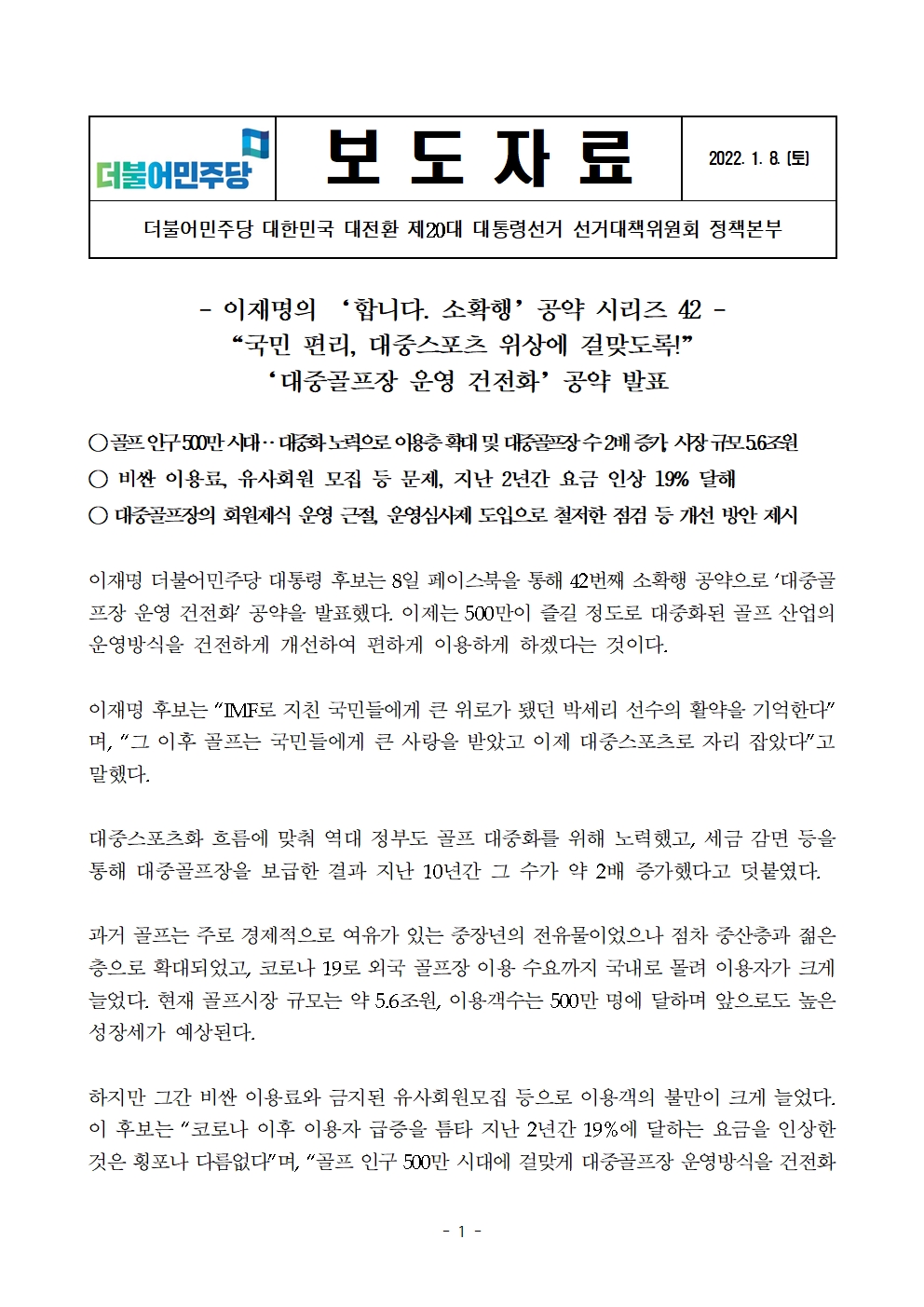[보도자료] 더불어민주당 선대위 정책본부, '이재명의 합니다. 소확행 공약 시리즈 42' 대중골프장 운영 건전화 공약