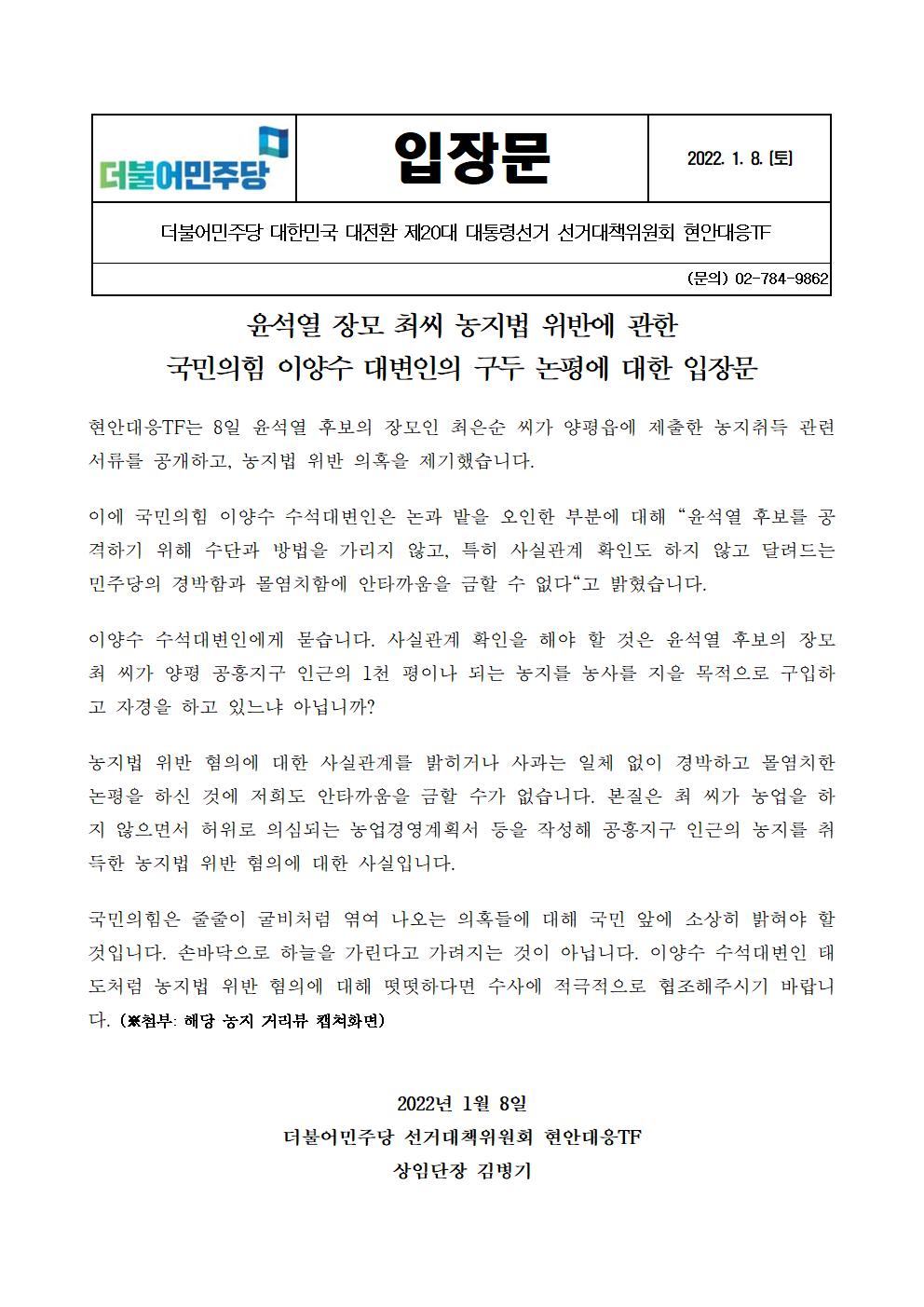 [입장문] 더불어민주당 선대위 현안대응 TF 윤석열 장모 최씨 농지법 위반 국민의힘 이양수 대변인 구도 논평에 대한