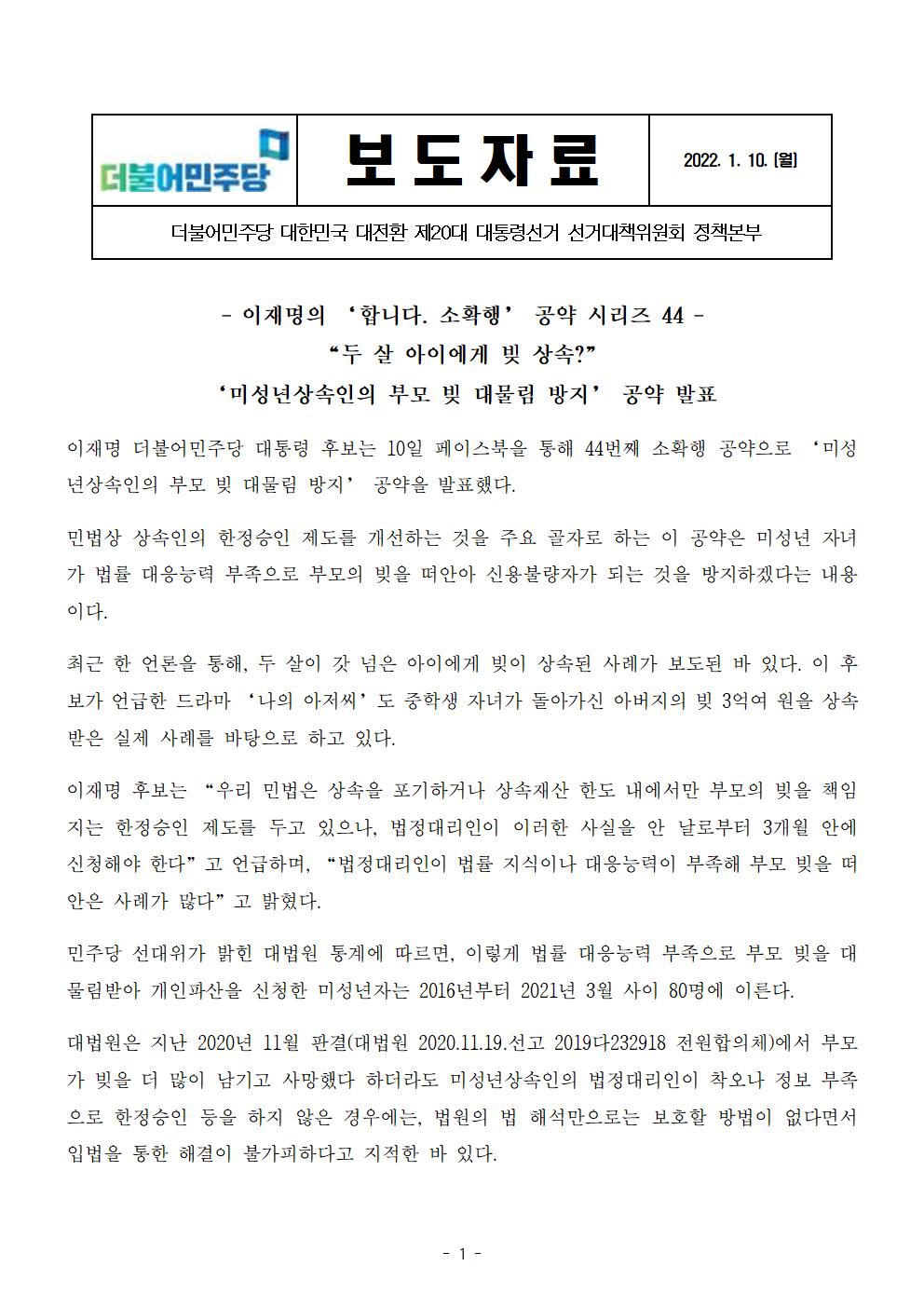 [보도자료] 더불어민주당 선대위 정책본부 이재명의 합니다. 소확행 공약 시리즈 44 미성년상속인의 부모 및 대물림 방지 공약 발표