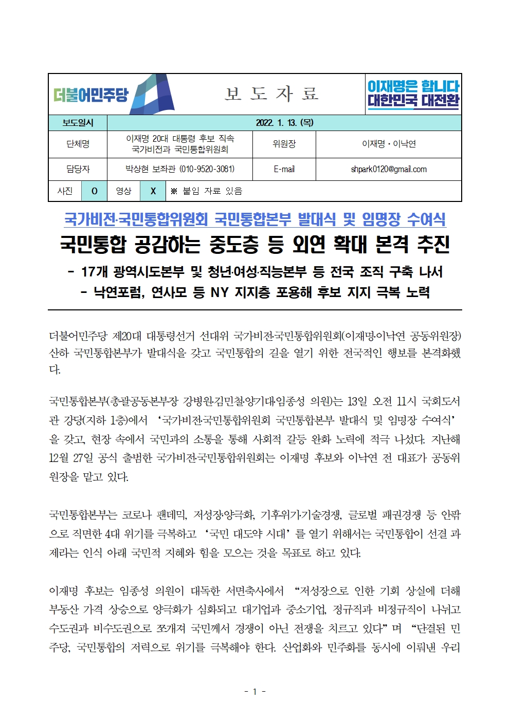 [보도자료] 더불어민주당 선대위 국가비전·국민통합위원회, 국민통합본부 발대식 및 임명장 수여식 개최