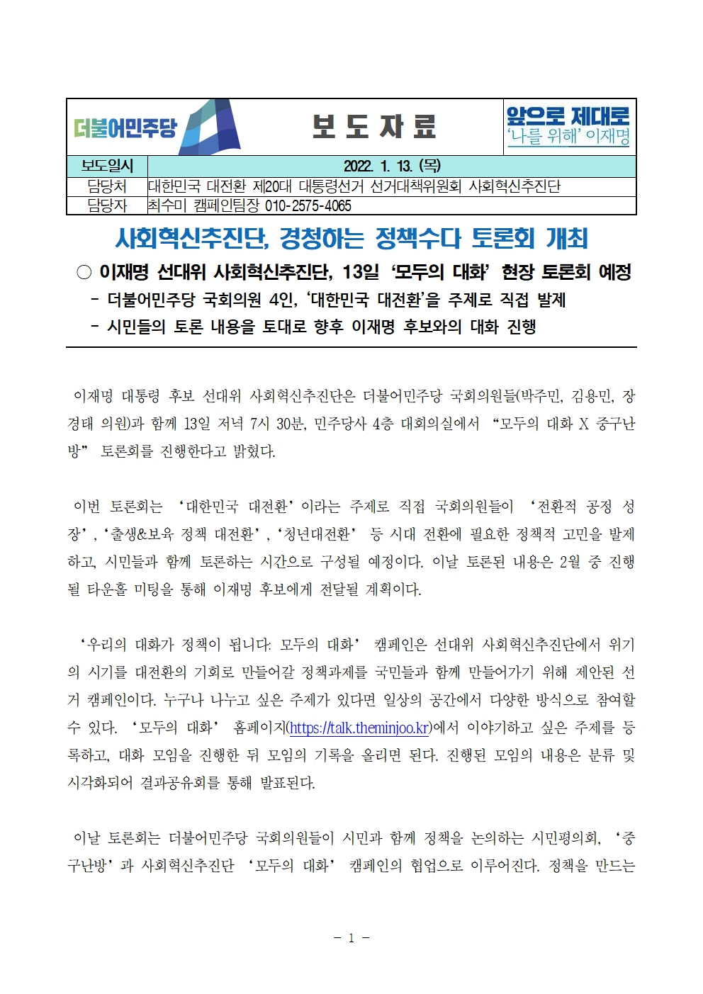 [보도자료] 더불어민주당 선대위 사회혁신추진단, 정책수다 모두의 대화 현장토론회 개최