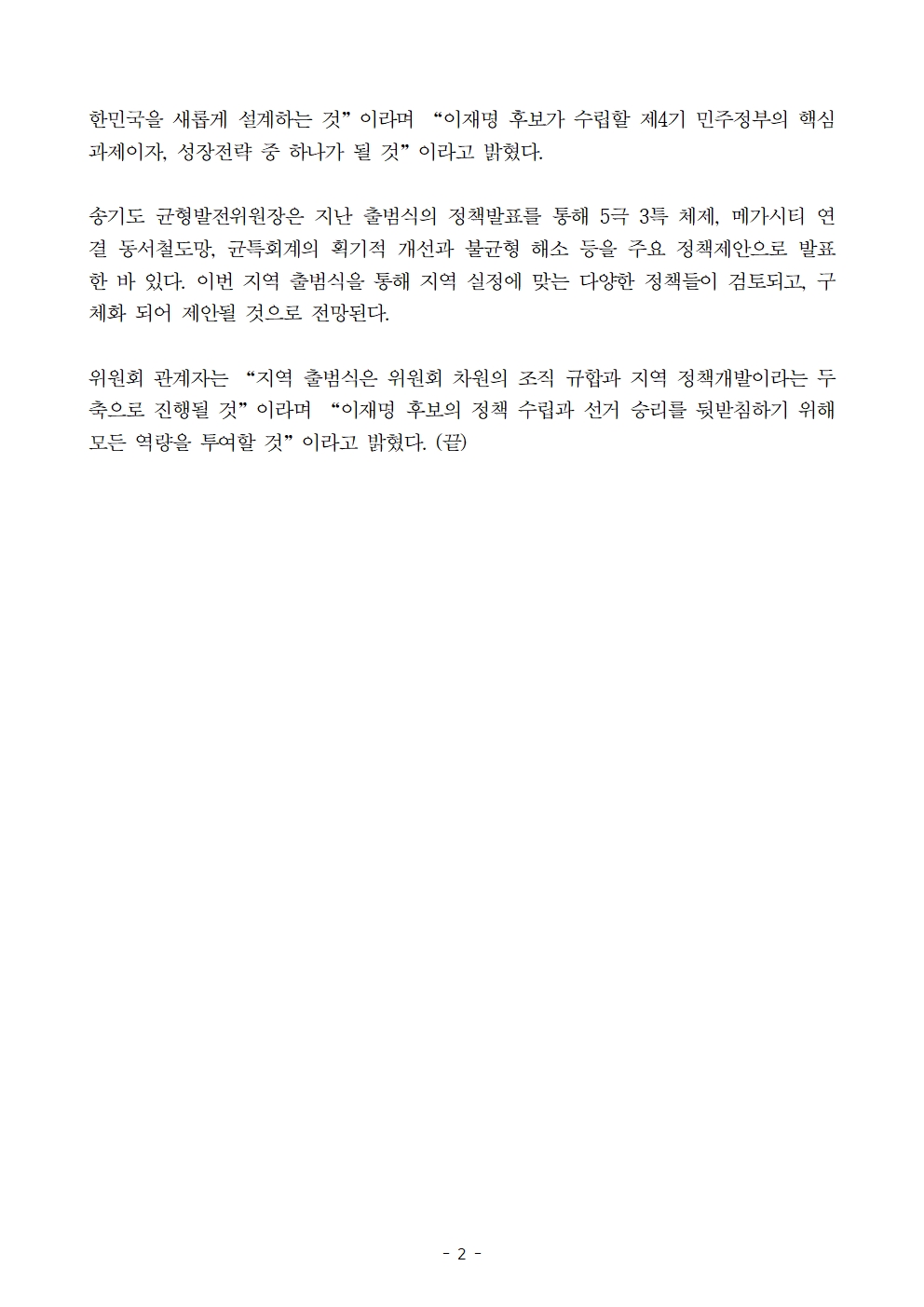 [보도자료] 더불어민주당 선대위 균형발전위원회, 광역단위 출범 및 전국 순회 예정