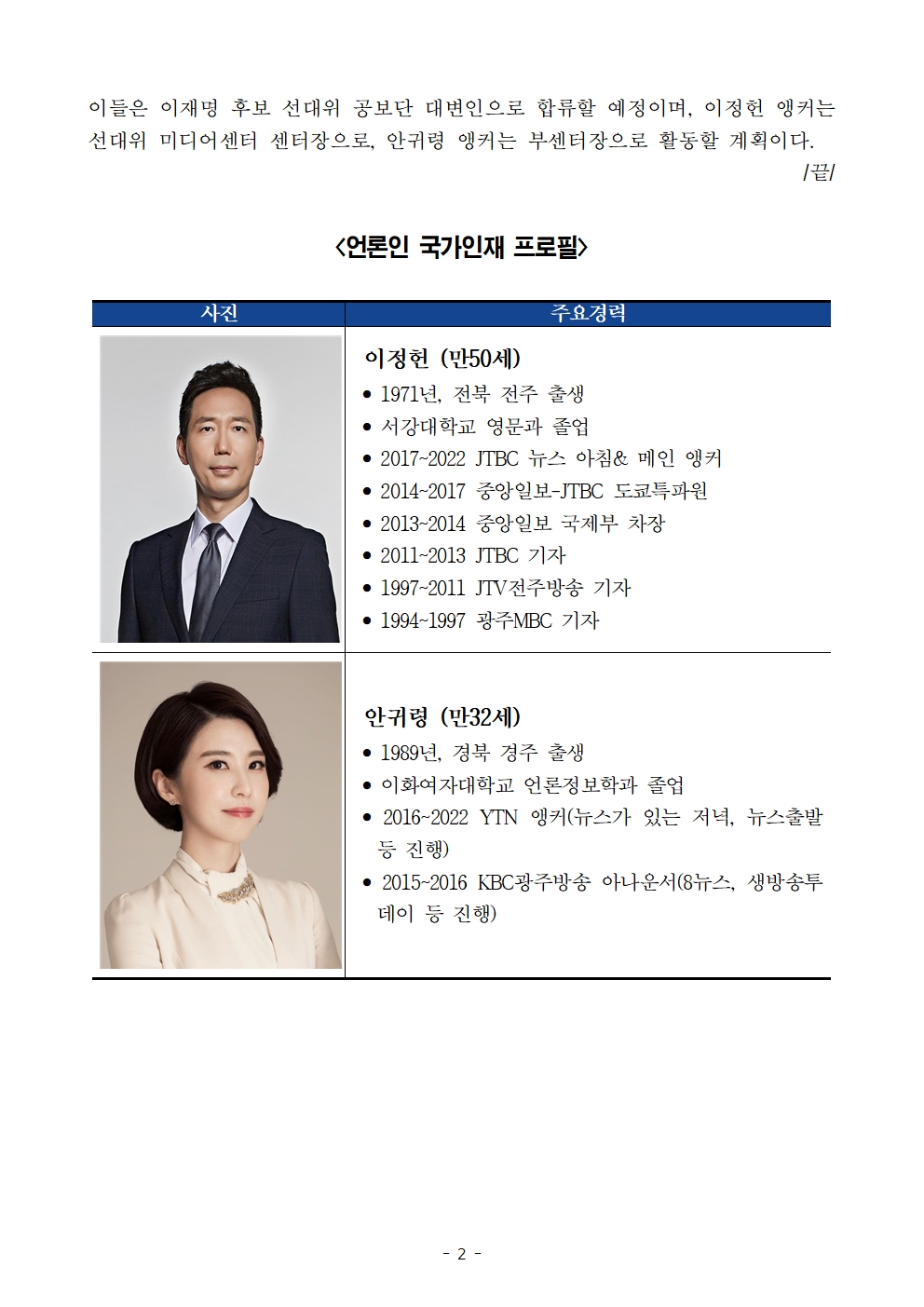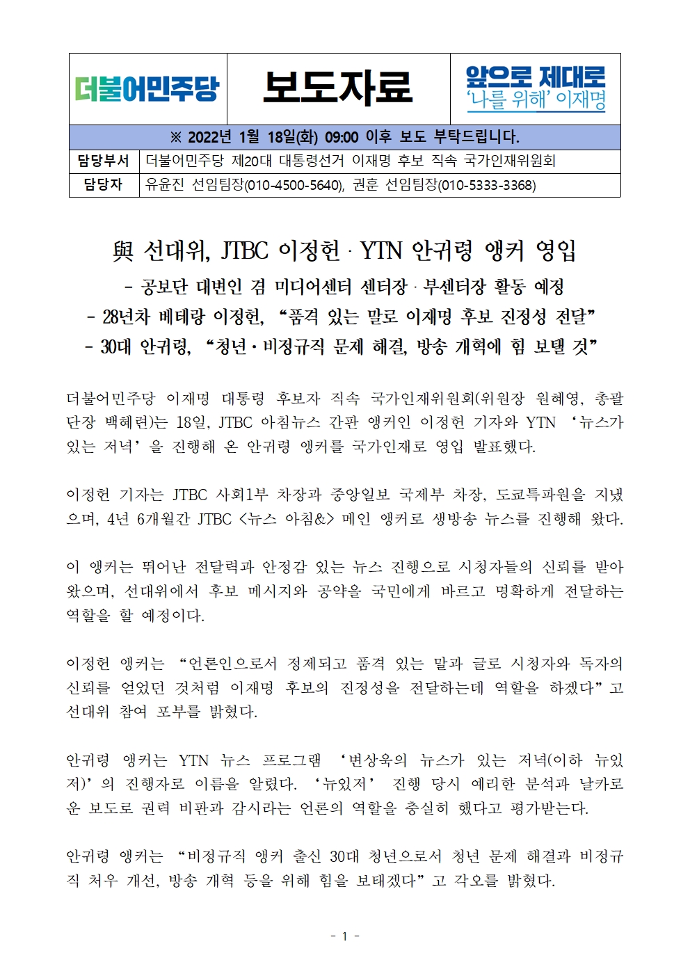 [보도자료] 더불어민주당 선대위 국가인재위원회, JTBC 이정헌 · YTN 안귀령 앵커 영입