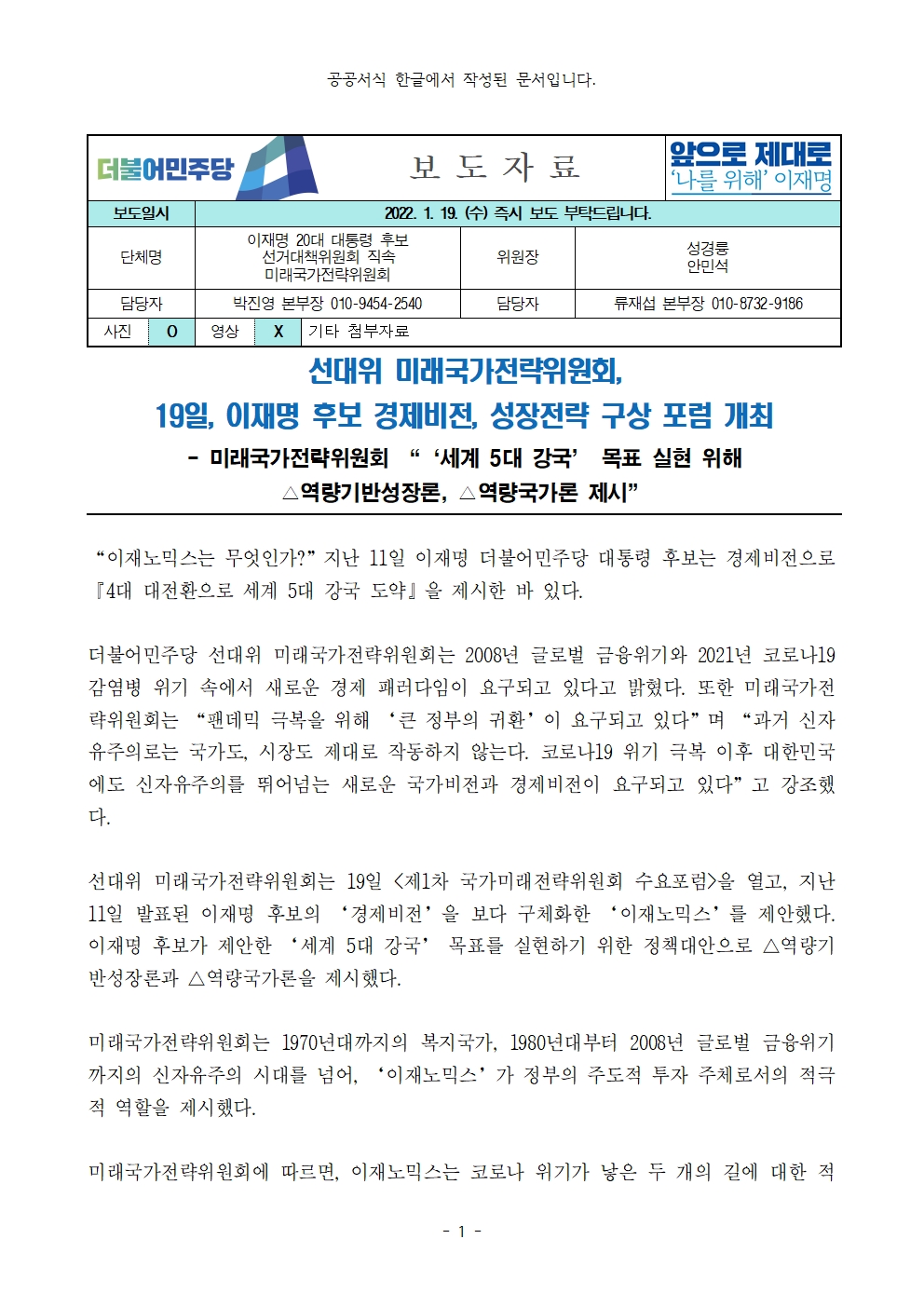 [보도자료] 더불어민주당 선대위 미래국가전략위원회, 국가미래전략위원회 수요포럼 개최