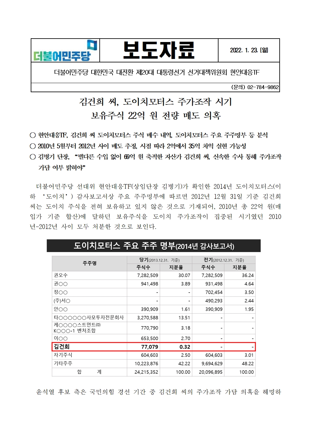 [보도자료]더불어민주당 선대위 현안대응TF, 김건희 씨, 도이치모터스 주가조작 시기 보유주식 22억 원 전량 매도 의혹