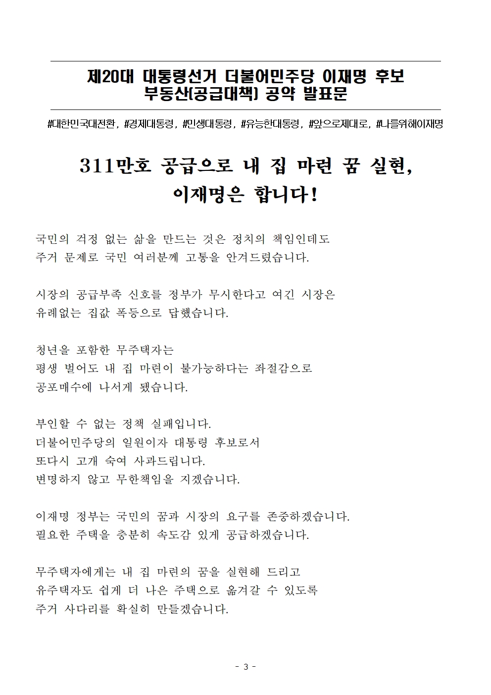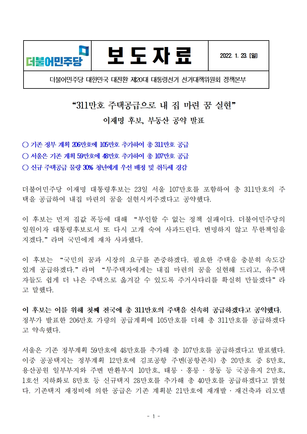 [보도자료] 더불어민주당 선대위 정책본부, 부동산 공급대책 공약 발표
