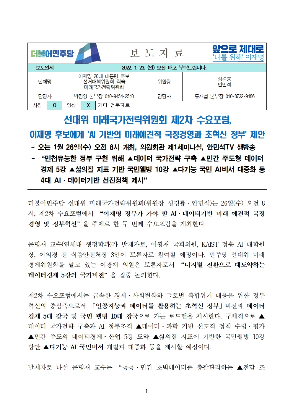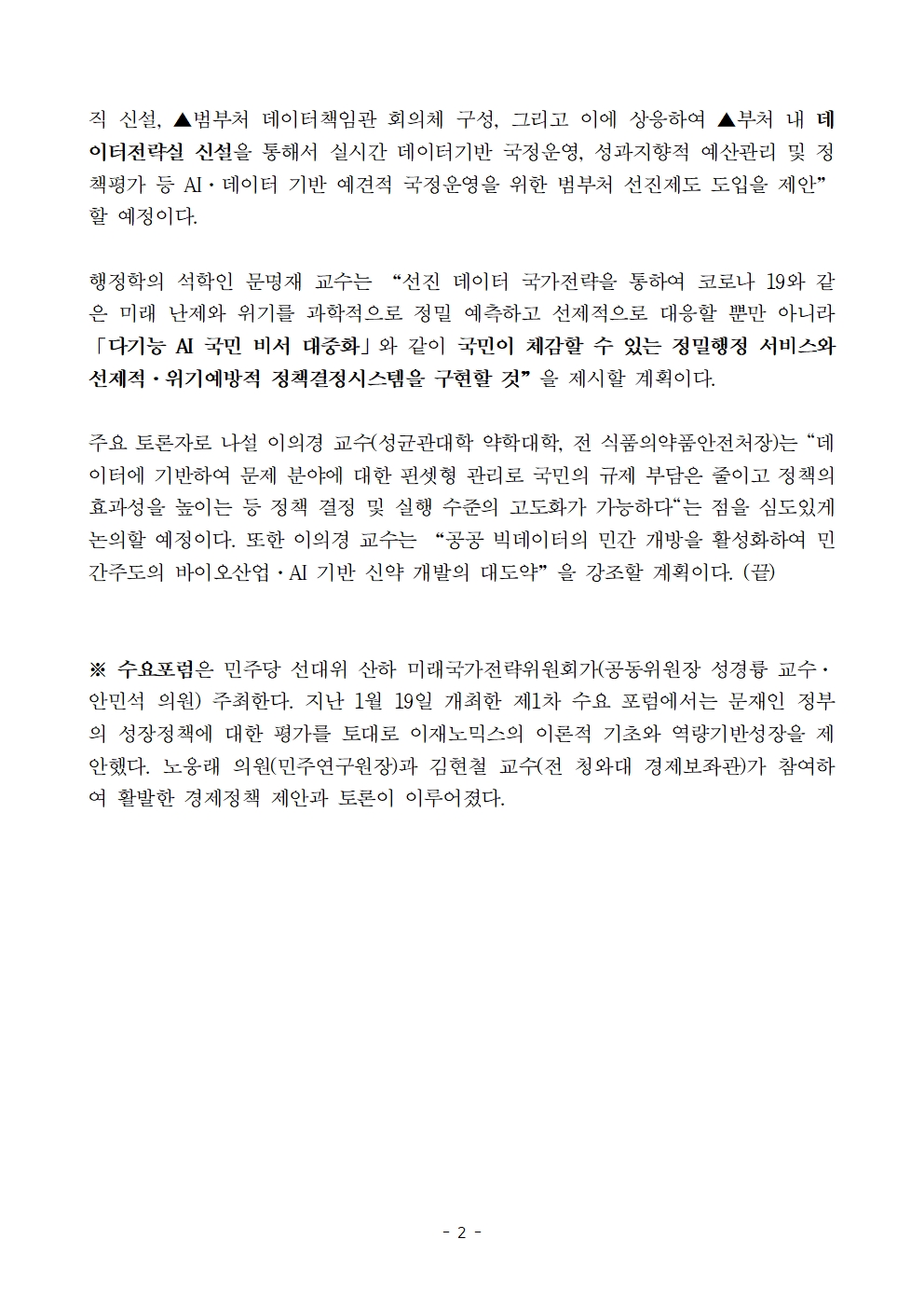 [보도자료] 더불어민주당 선대위 미래국가전략위원회, 제2차 수요포럼 개최