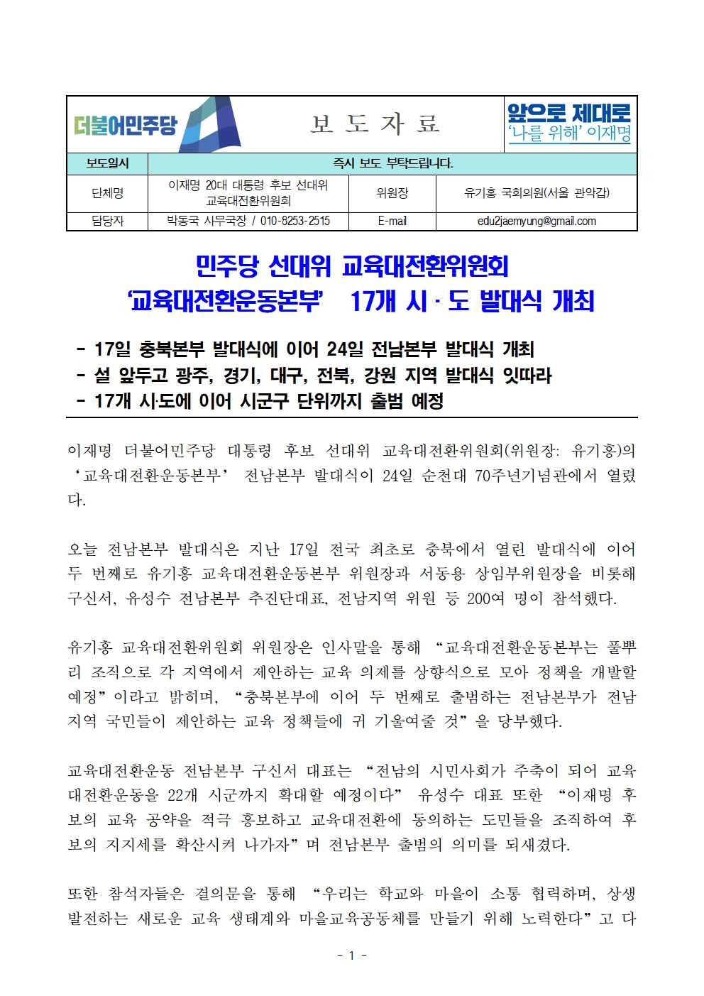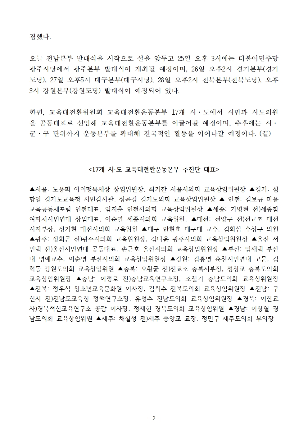[보도자료] 더불어민주당 선대위 교육대전환위원회, '교육대전환운동본부' 17개 시·도 발대식 개최