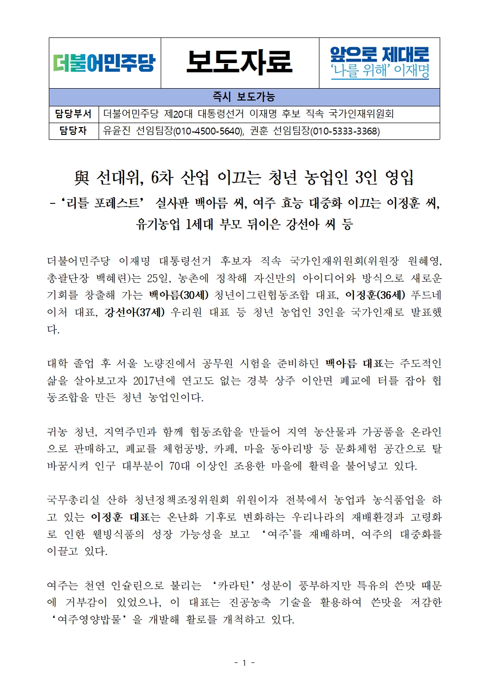 [보도자료] 더불어민주당 선대위 국가인재위원회, 6차 산업 이끄는 청년 농업인 3인 영입