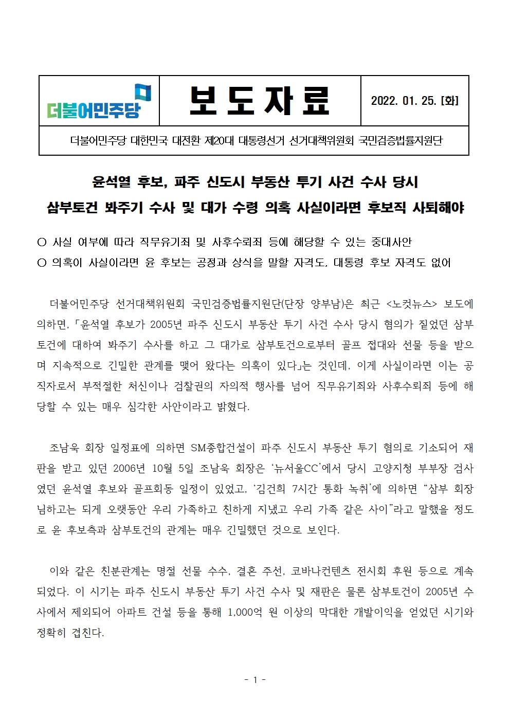 [보도자료] 더불어민주당 선대위 국민검증법률지원단, 윤석열 후보 삼부토건 봐주기 수사 의혹 관련 기자회견