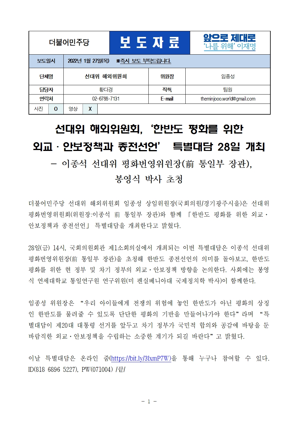 [보도자료] 더불어민주당 선대위 해외위원회, '한반도 평화를 위한 외교·안보정책과 종전선언' 특별대담 개최