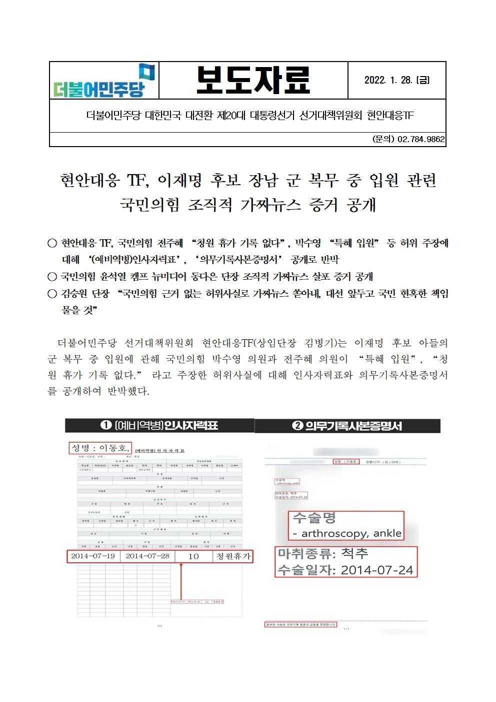 [보도자료] 더불어민주당 선대위 현안대응TF, 이재명 후보 장남 군 복무 중 입원 관련 국민의힘 조직적 가짜뉴스 살포 증거 공개