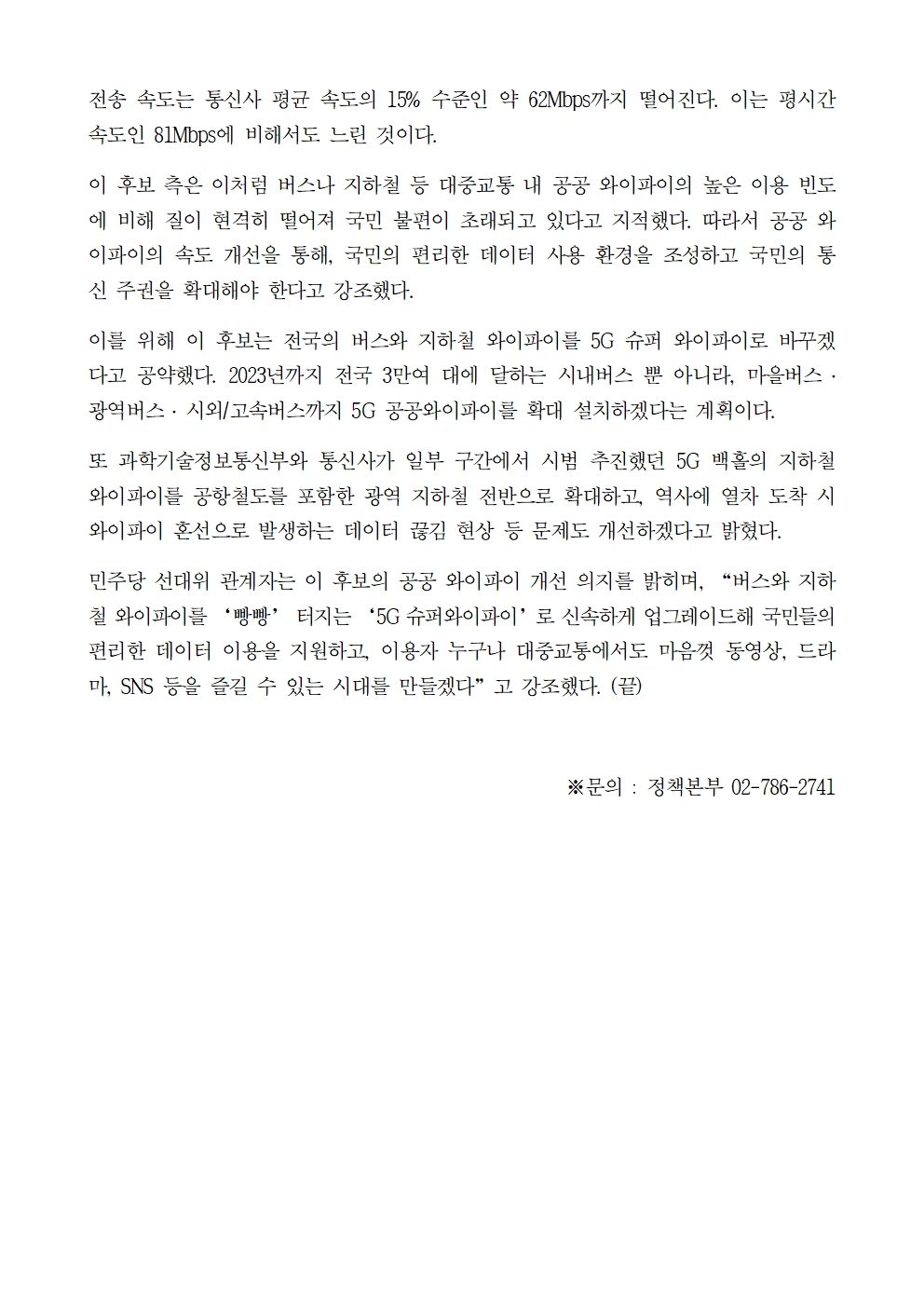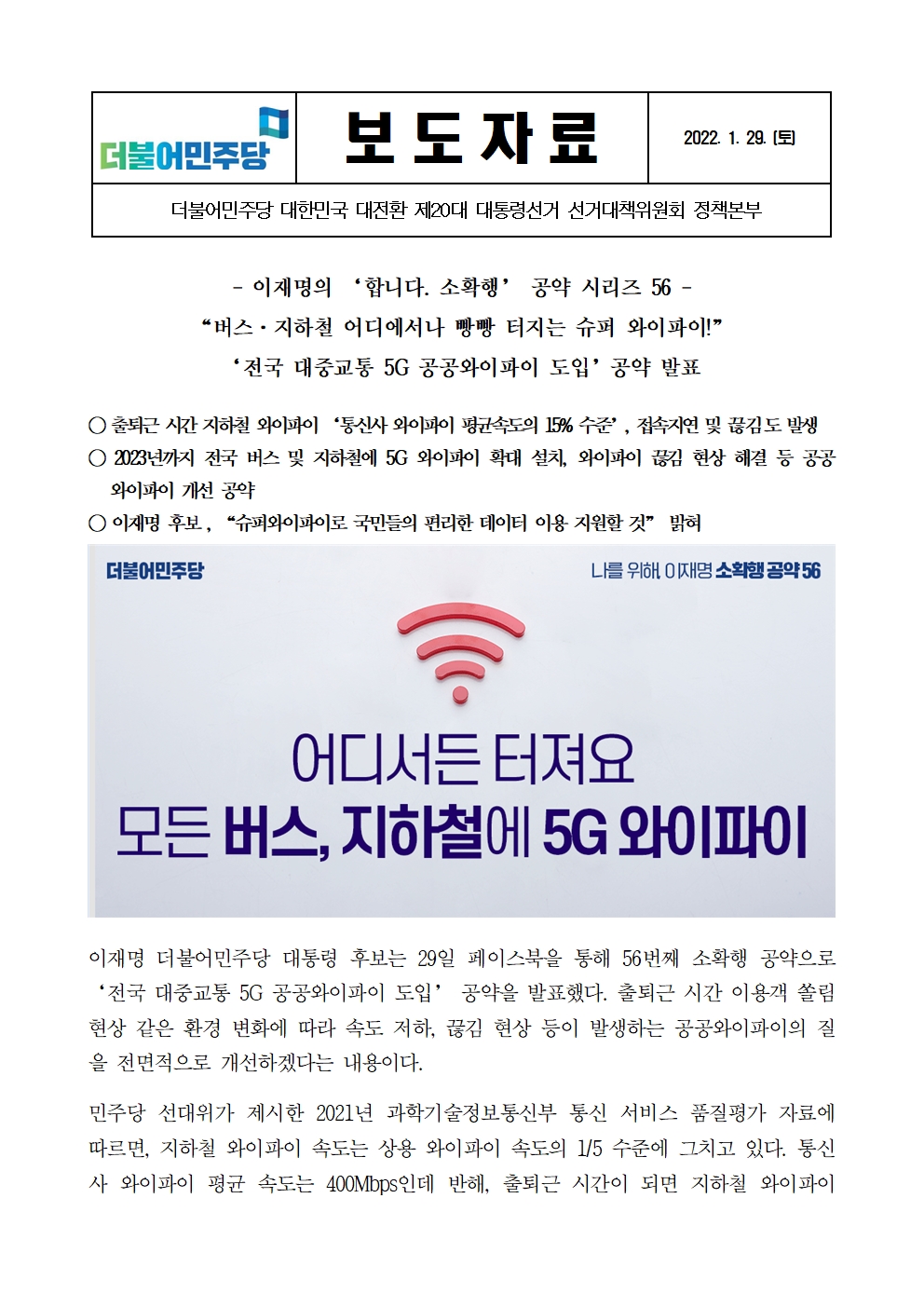 [보도자료] 더불어민주당 선대위 정책본부, '이재명은 합니다. 소확행 공약 시리즈 56' 전국 대중교통 5G 공공와이파이 도입 공약