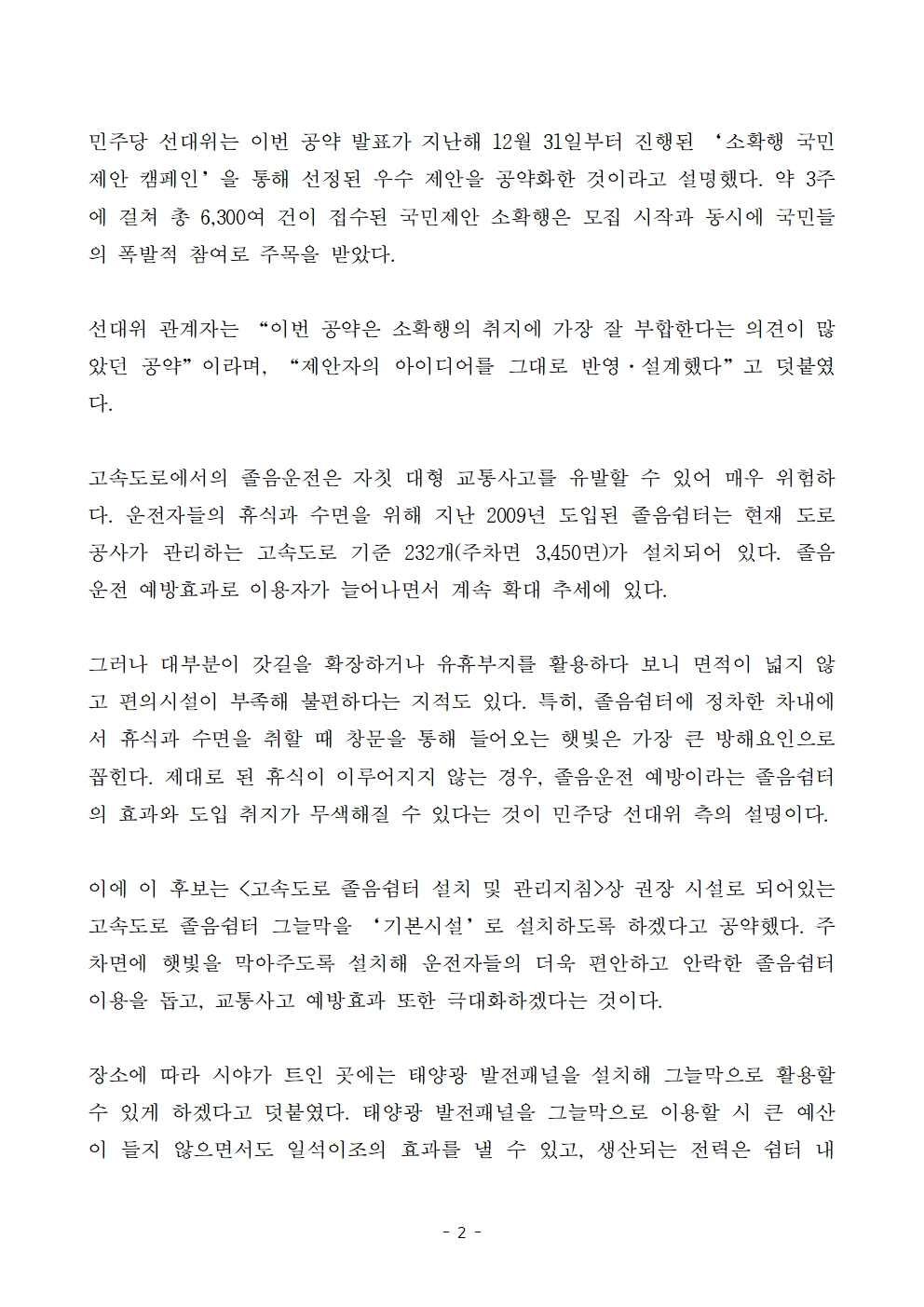 [보도자료] 더불어민주당 선대위 정책본부, '이재명은 합니다. 소확행 공약 시리즈 58' 고속도로 졸음쉼터 그늘막 설치 공약 발표