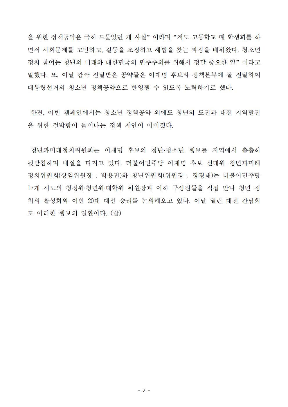 [보도자료] 더불어민주당 선대위 청년과미래정치위원회 청소년 유권자를 위한 정책공약 제안 받아