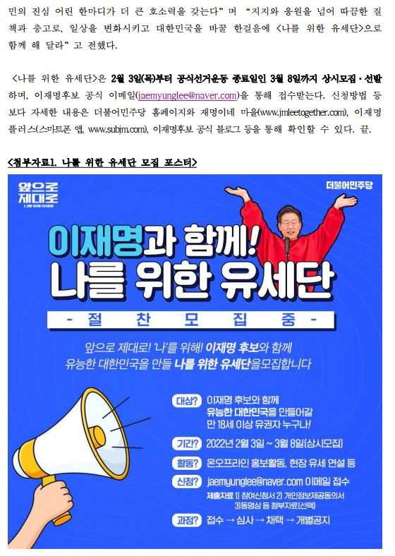 [보도자료] 민주당 선대위, 일반 유권자 대상 '나를 위한 유세단' 공개모집