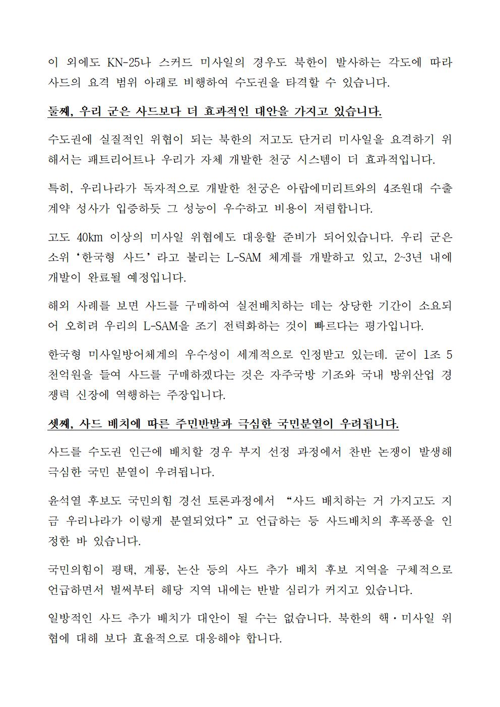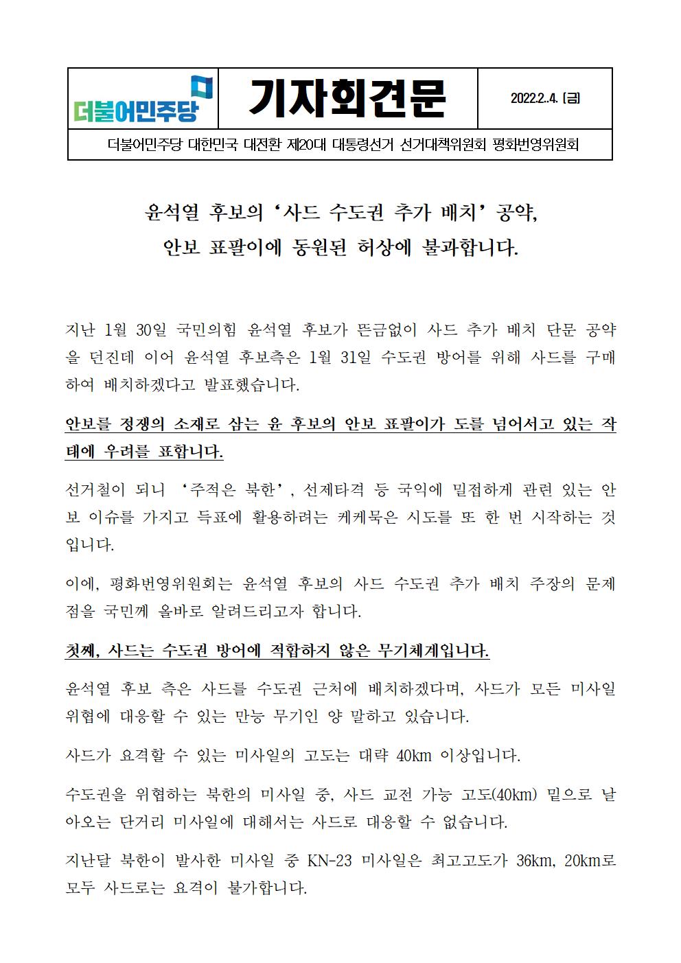[기자회견문] 더불어민주당 선대위 평화번영위원회 윤석열 후보의 사드 수도권 추가 배치 공약