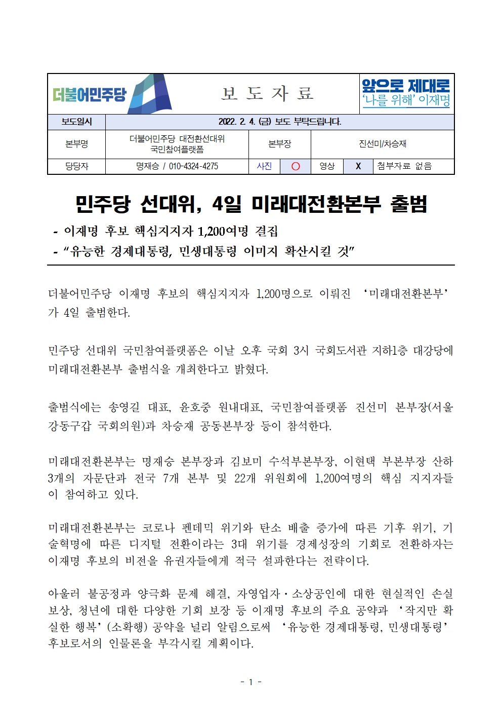 [보도자료] 더불어민주당 선대위 국민참여플랫폼, 미래대전환본부 출범