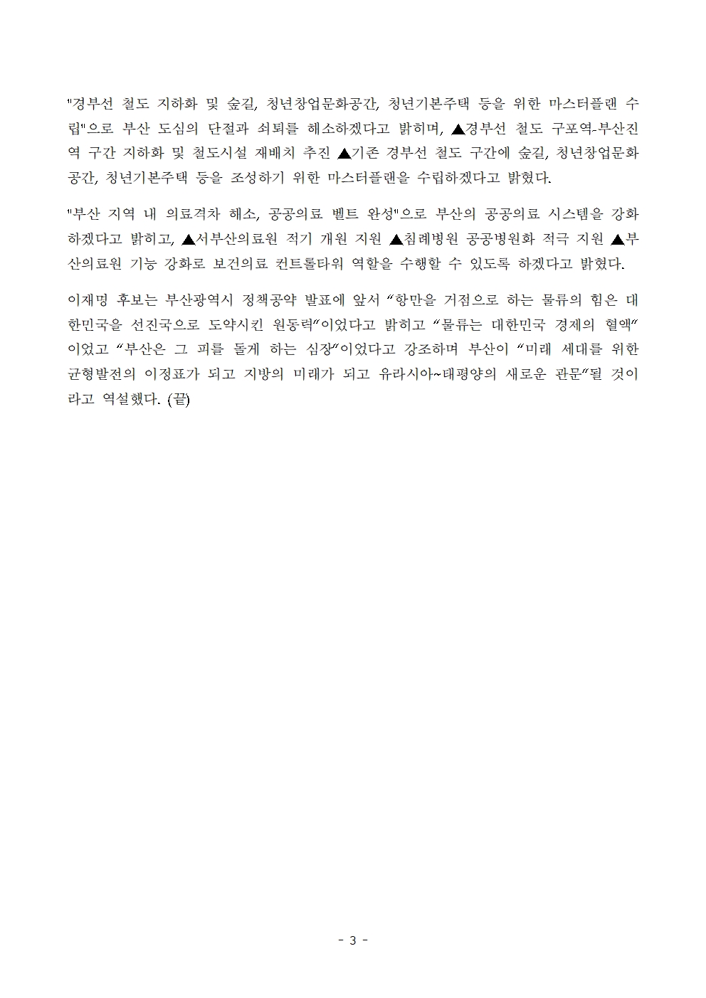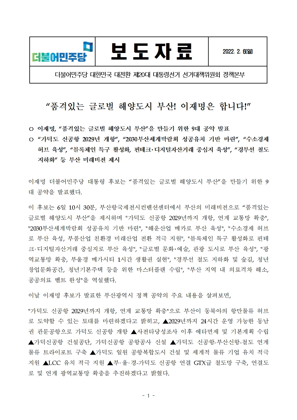 [보도자료] 더불어민주당 선대위 정책본부, 부산 9대 공약 발표