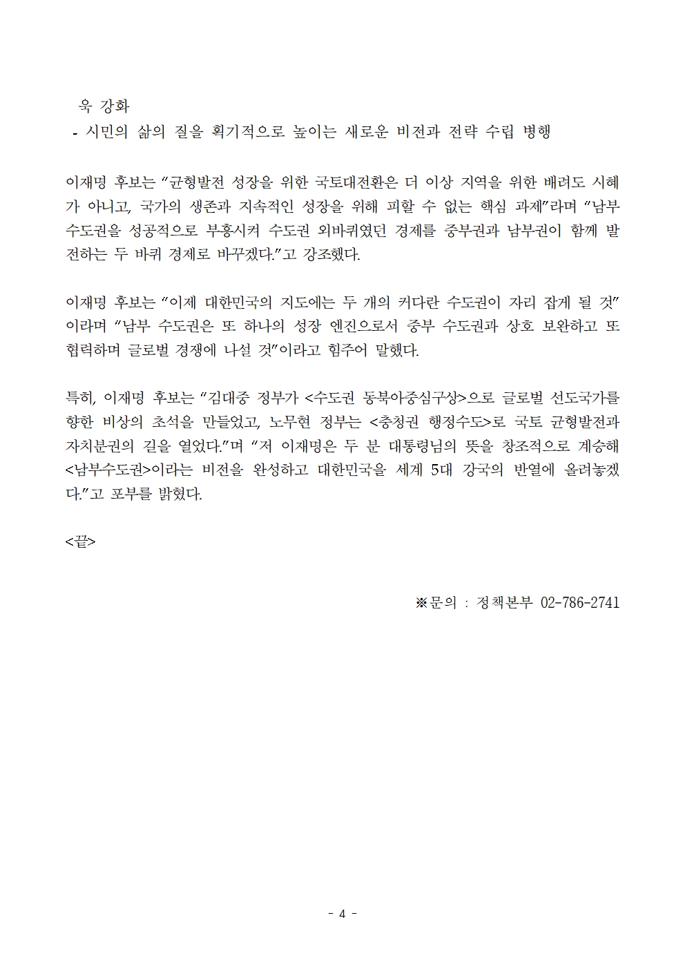 [보도자료] 더불어민주당 선대위 정책본부, 국가균형발전·국가경제성장 핵심전략 '남부수도권 구상' 발표