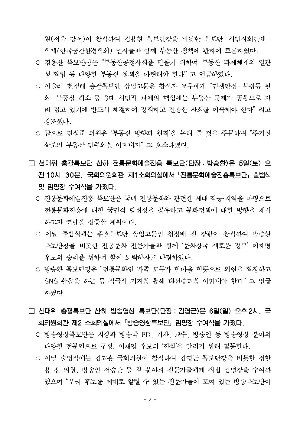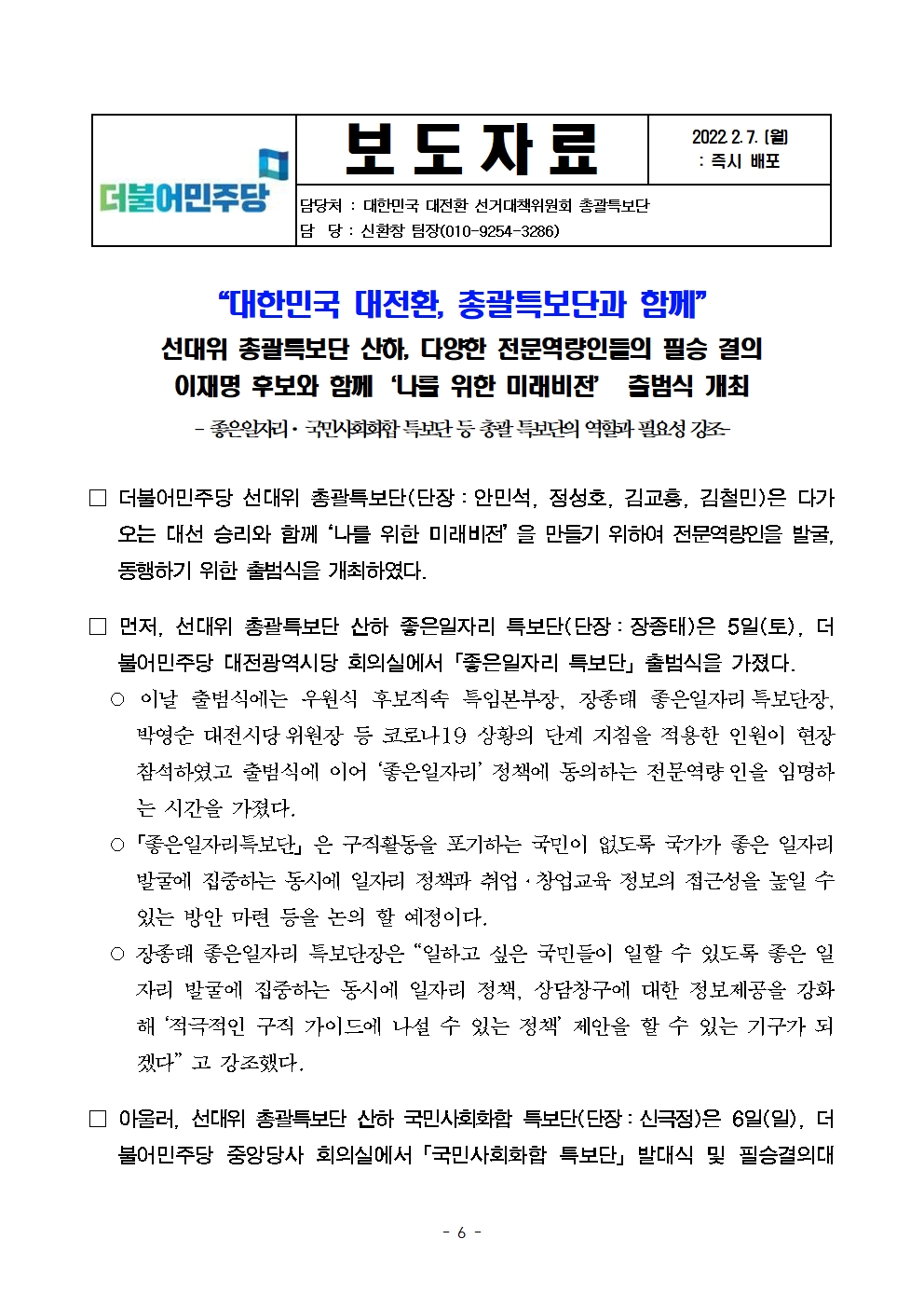 [보도자료] 더불어민주당 선대위 총괄특보단, 전문역량별 특보단 출범식 개최 및 필승 결의